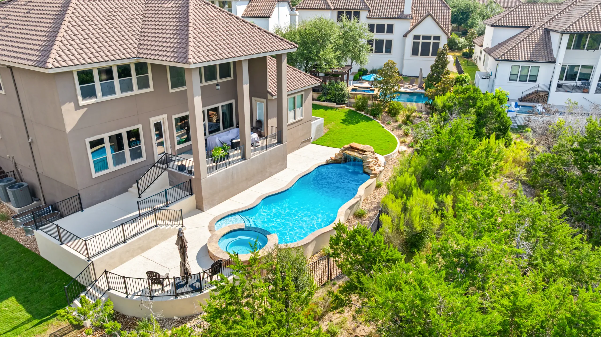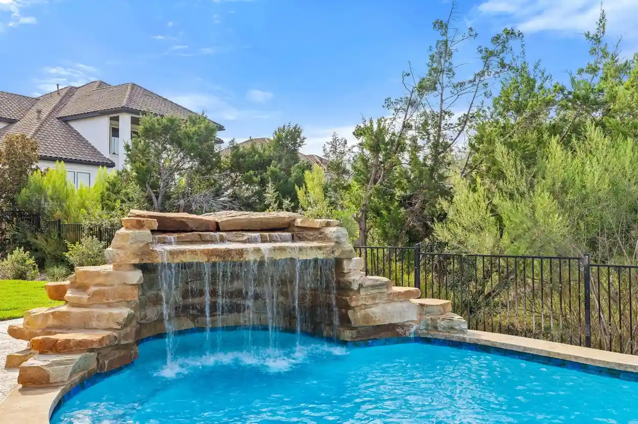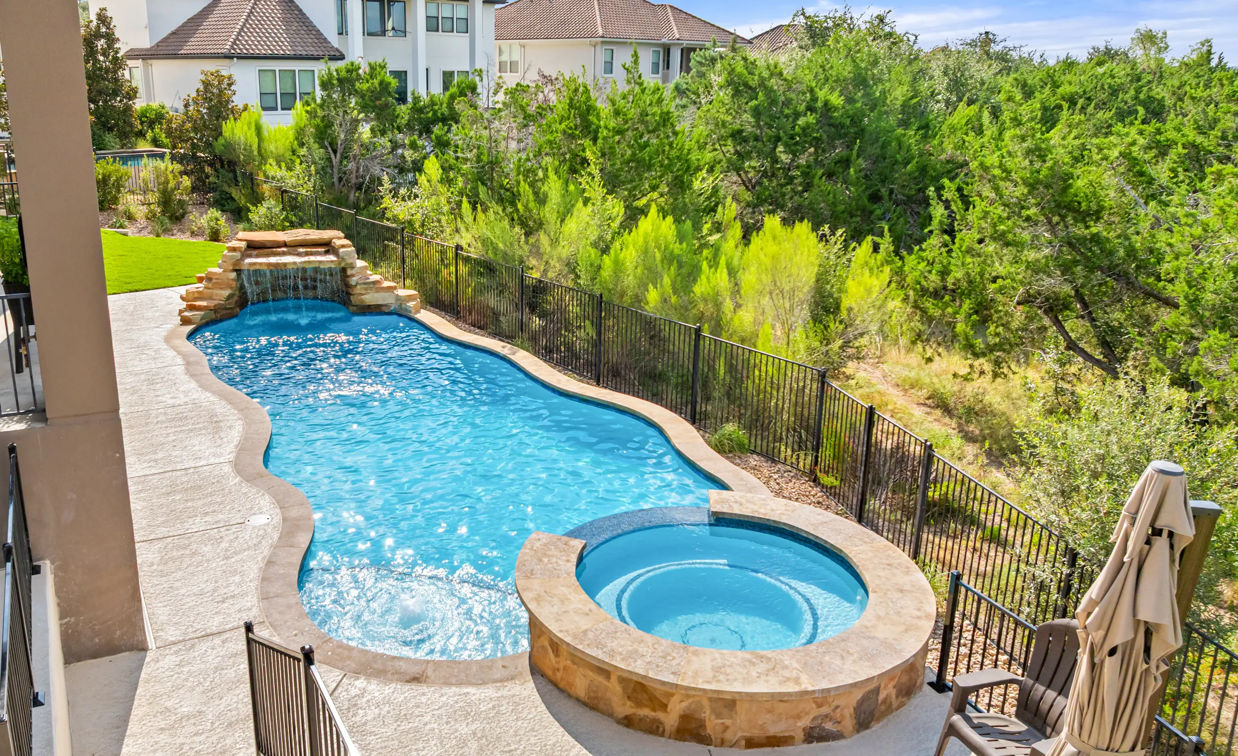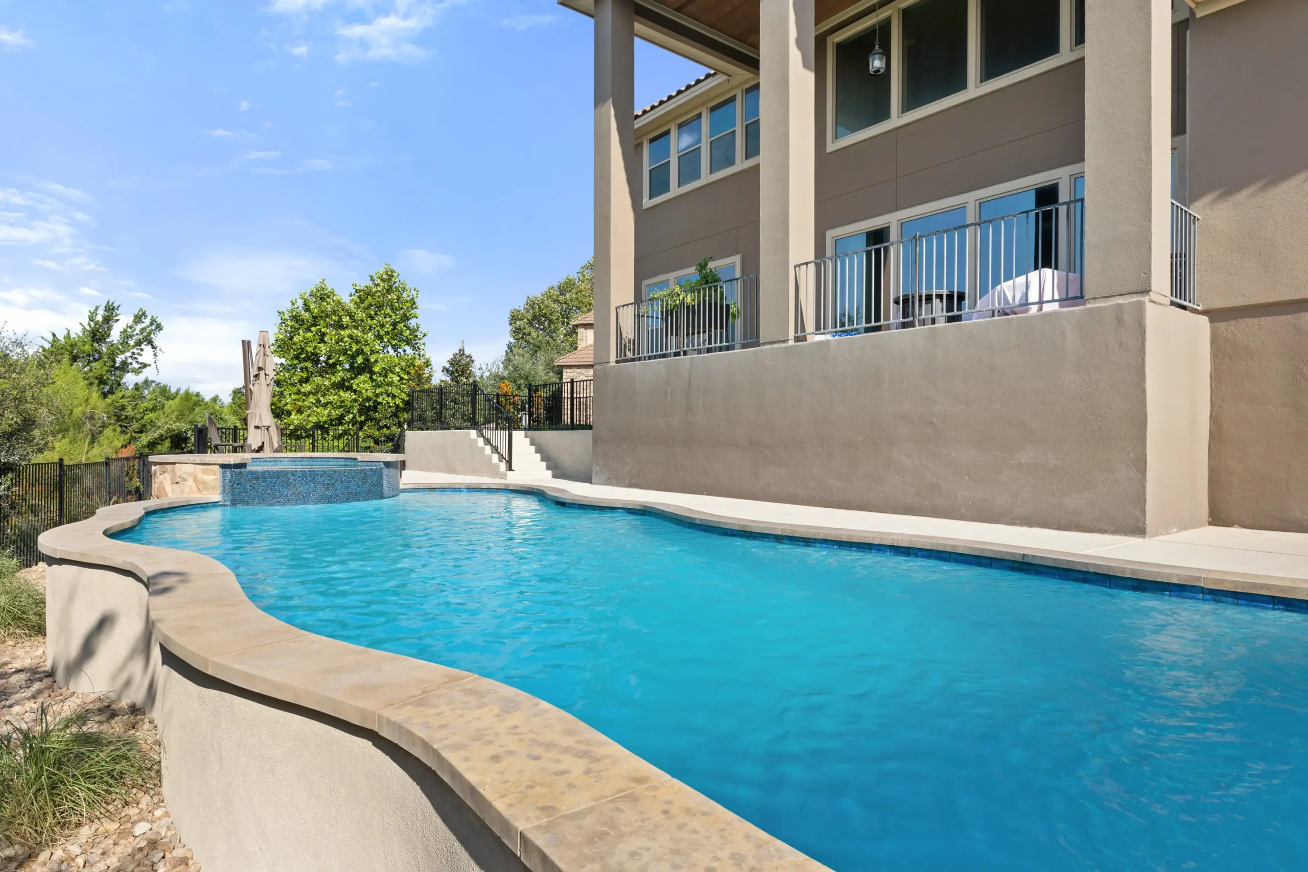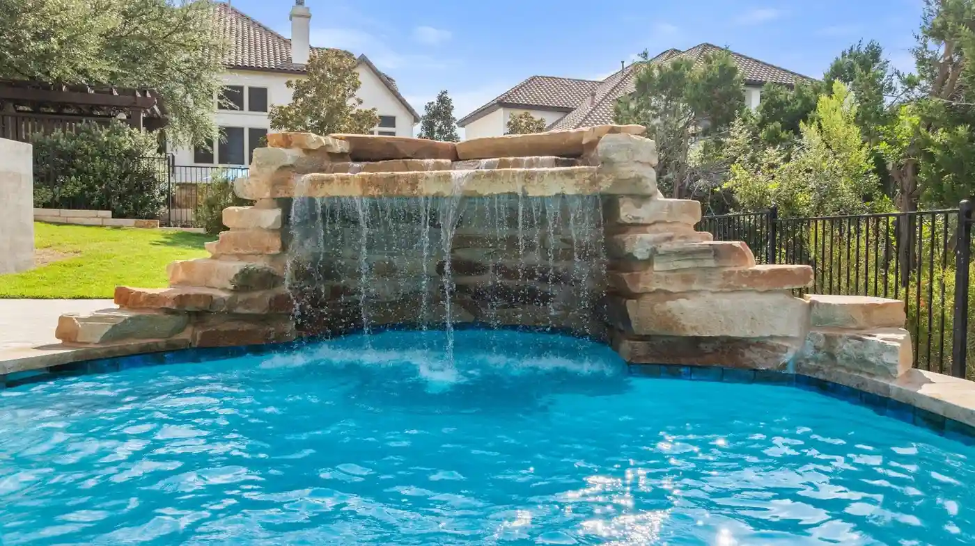 With cascading water features and a grotto-inspired spa, Cascade Cove captures the serene energy of nature. A tanning ledge and sunken seating area bring a spa-like vibe, while fire bowls and custom lighting add drama in the evenings. This pool is designed for total escape.