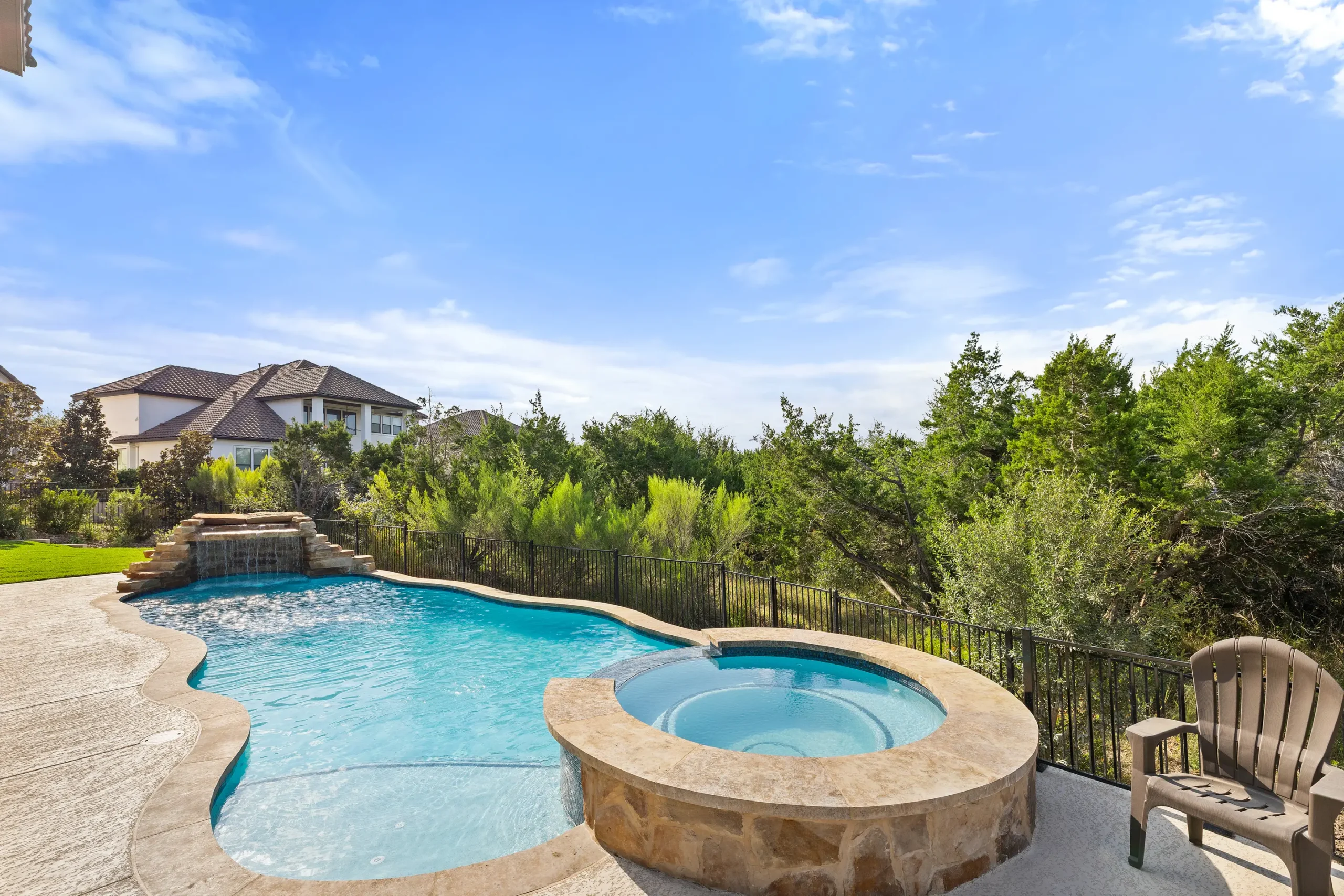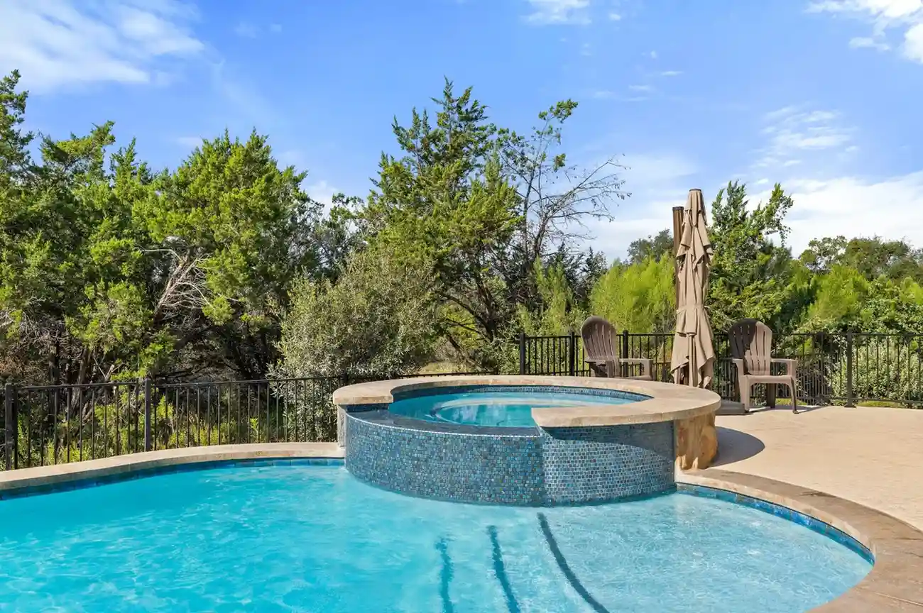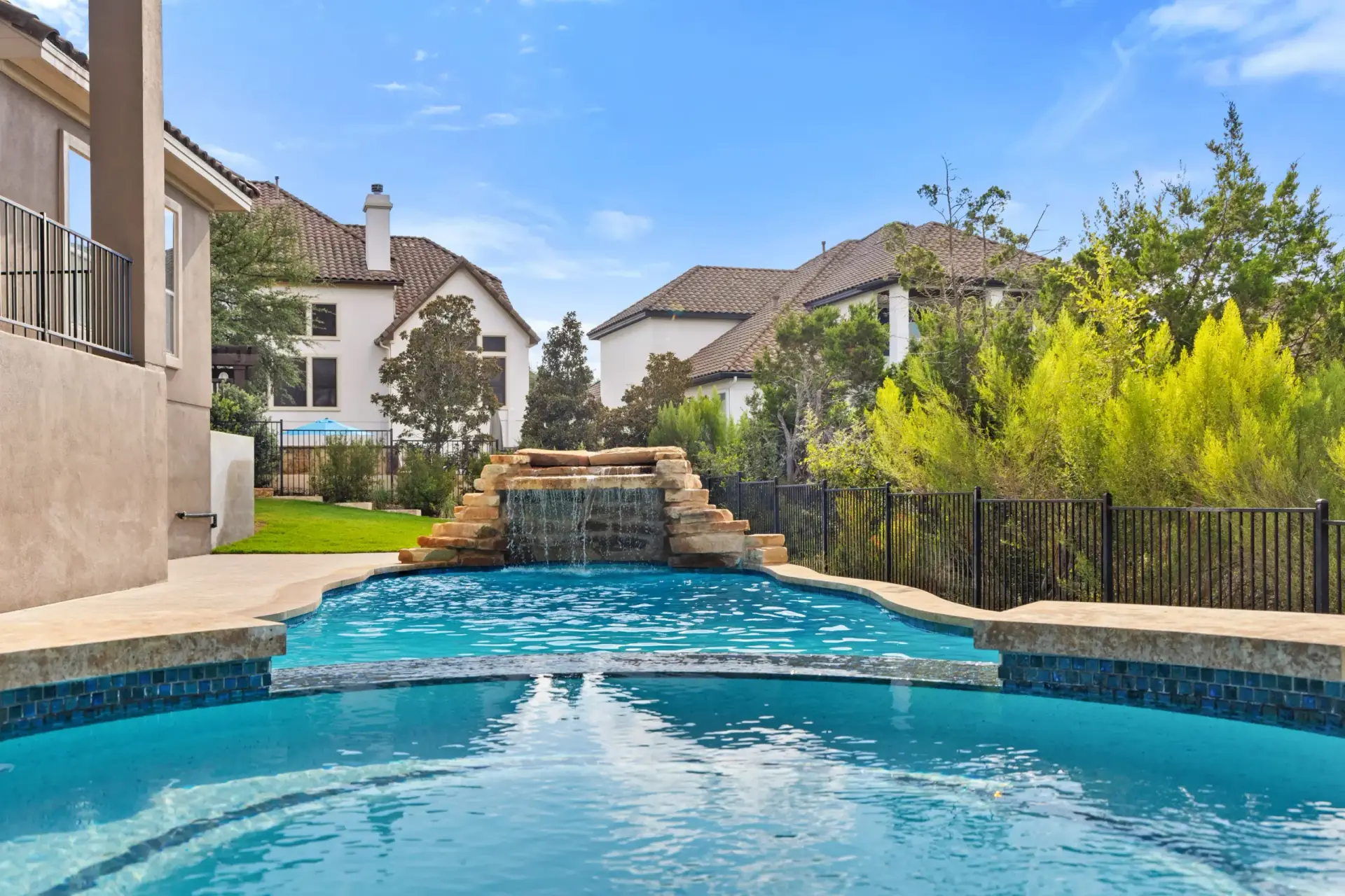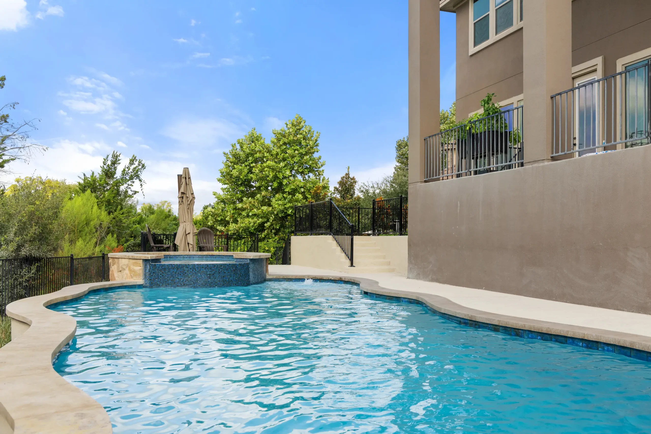 With cascading water features and a grotto-inspired spa, Cascade Cove captures the serene energy of nature. A tanning ledge and sunken seating area bring a spa-like vibe, while fire bowls and custom lighting add drama in the evenings. This pool is designed for total escape.