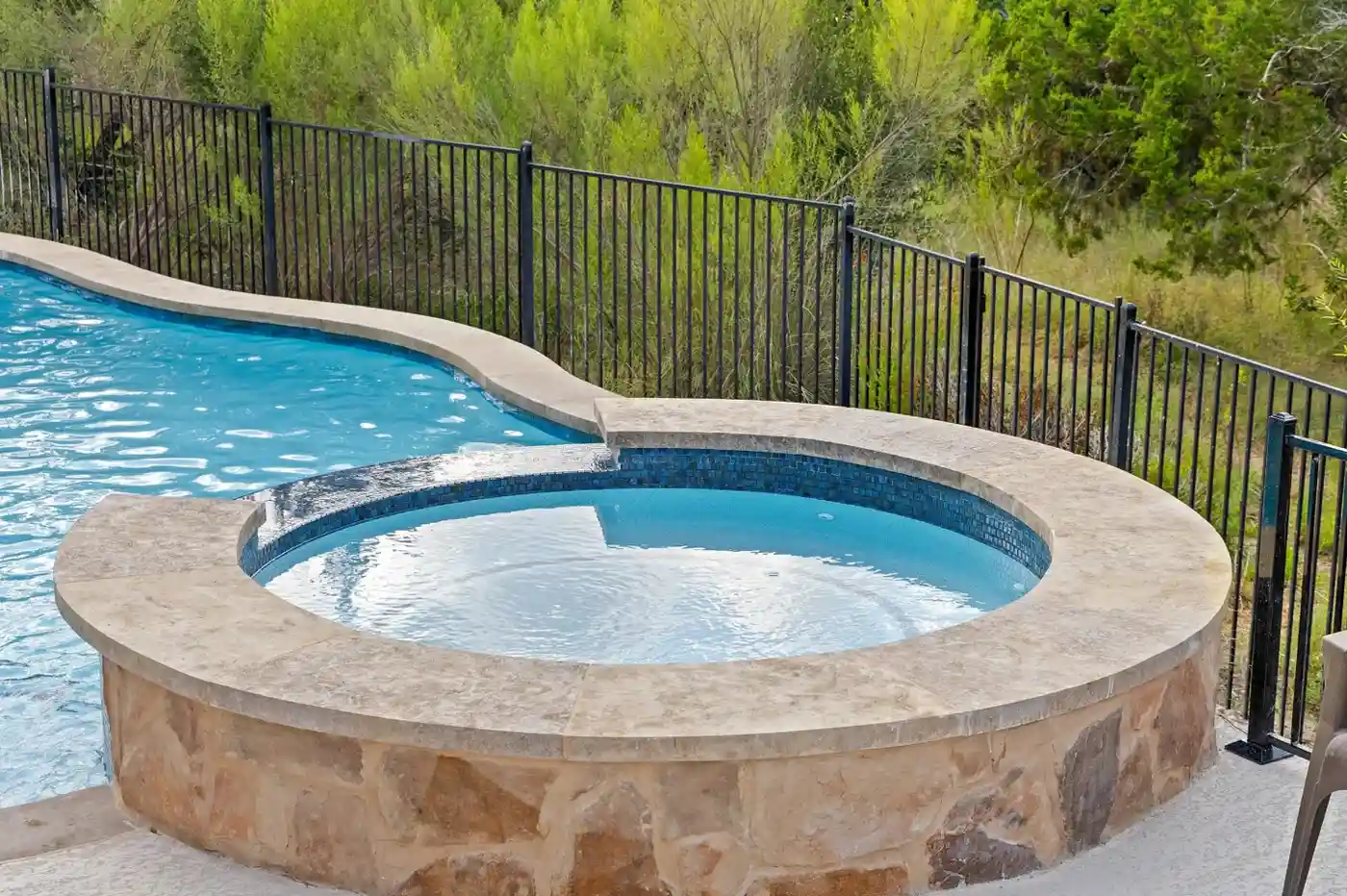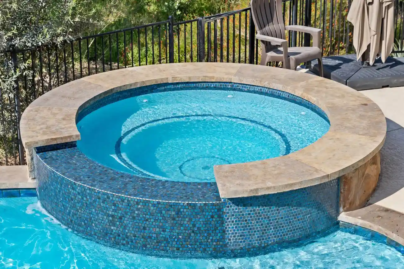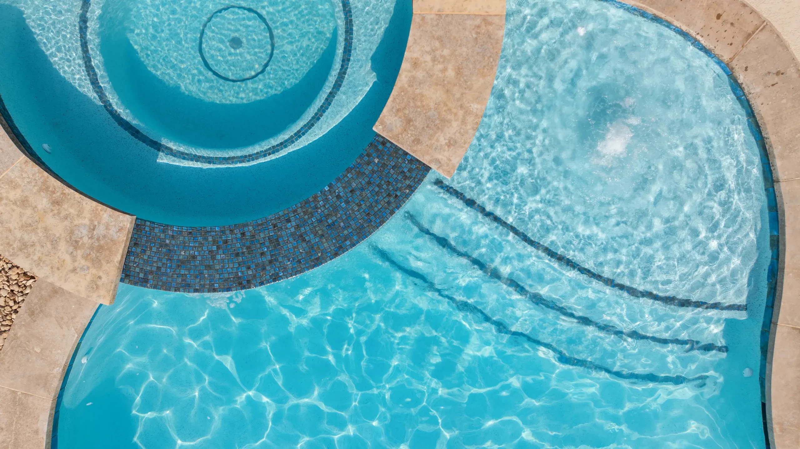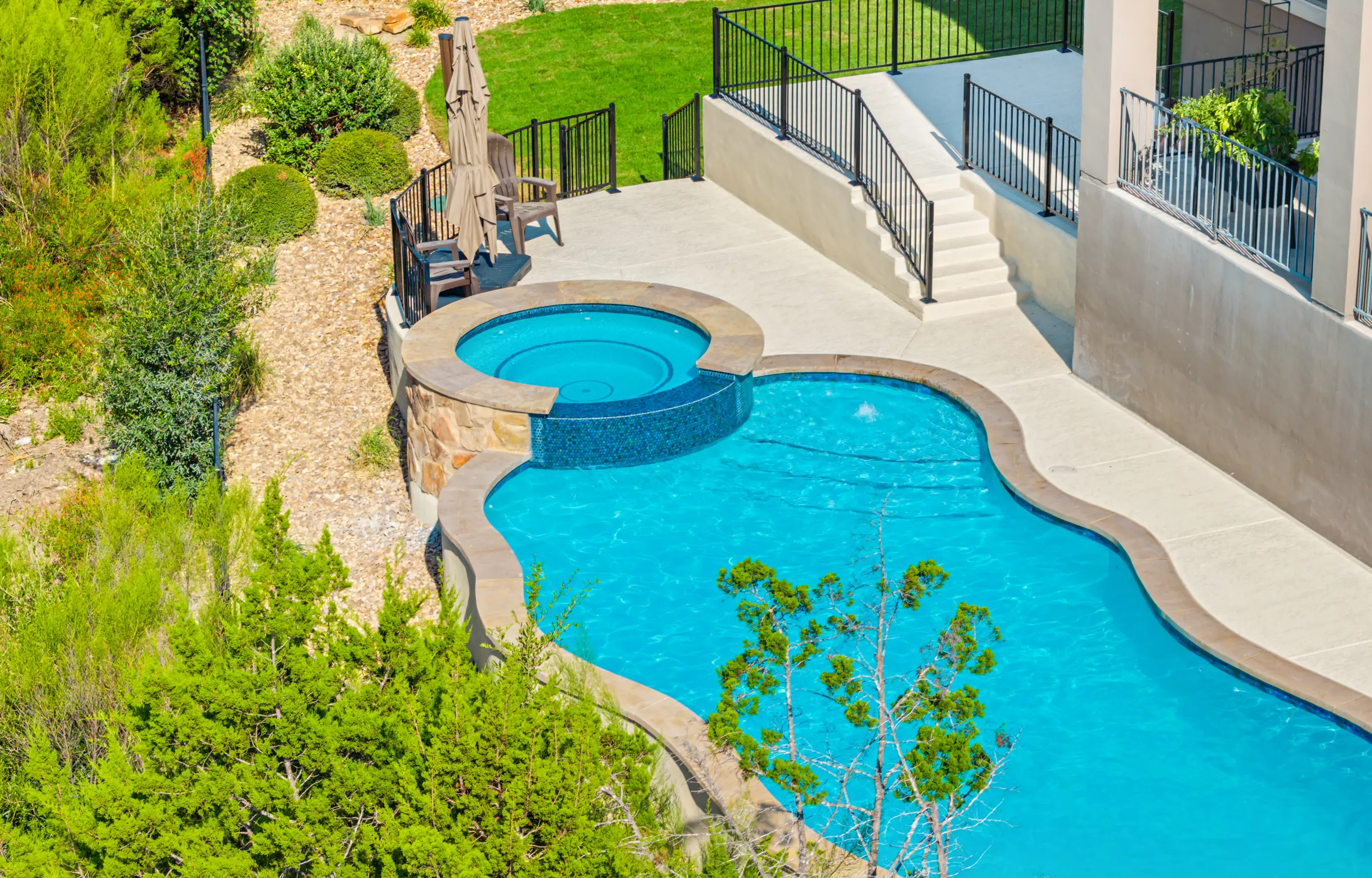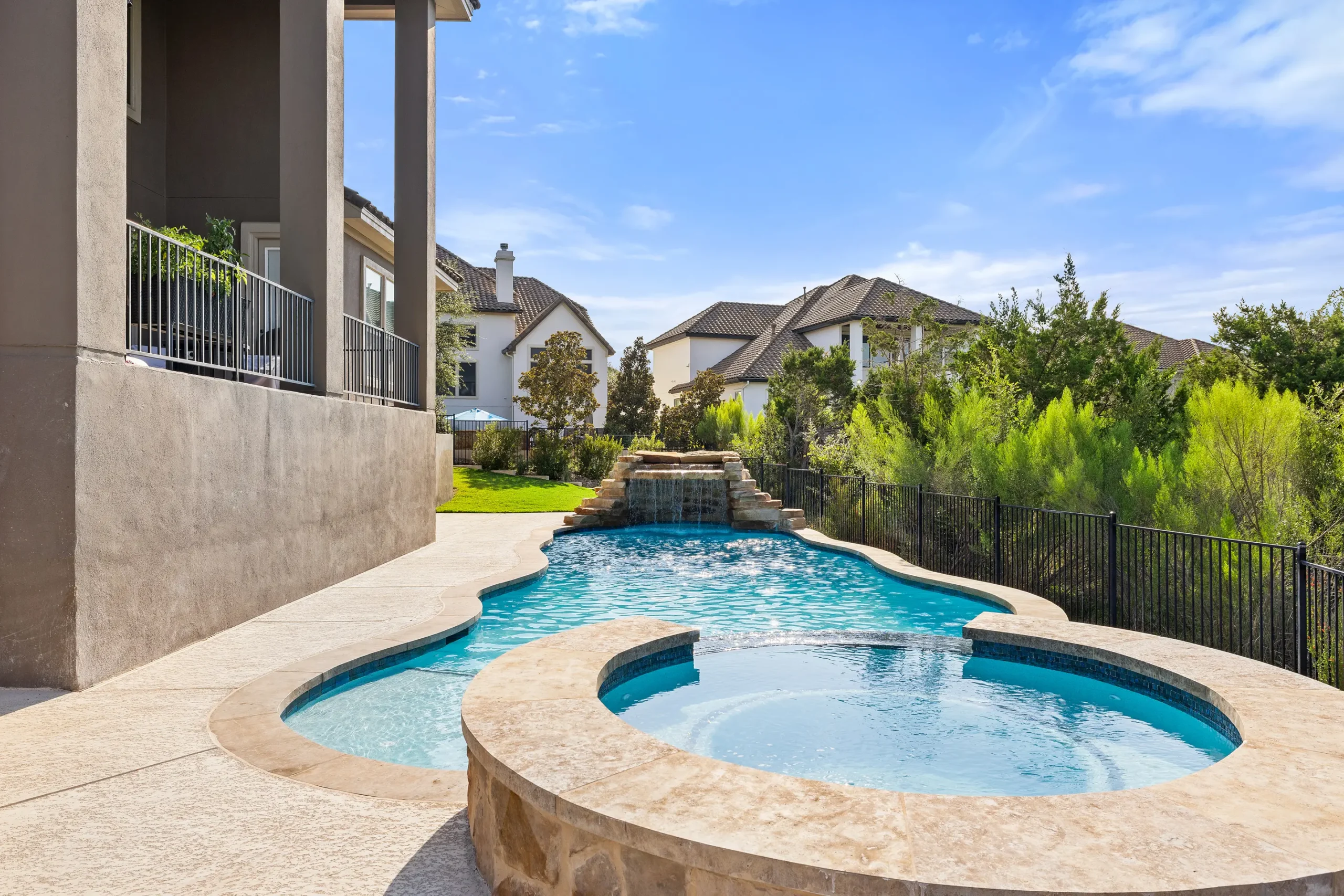 With cascading water features and a grotto-inspired spa, Cascade Cove captures the serene energy of nature. A tanning ledge and sunken seating area bring a spa-like vibe, while fire bowls and custom lighting add drama in the evenings. This pool is designed for total escape.
