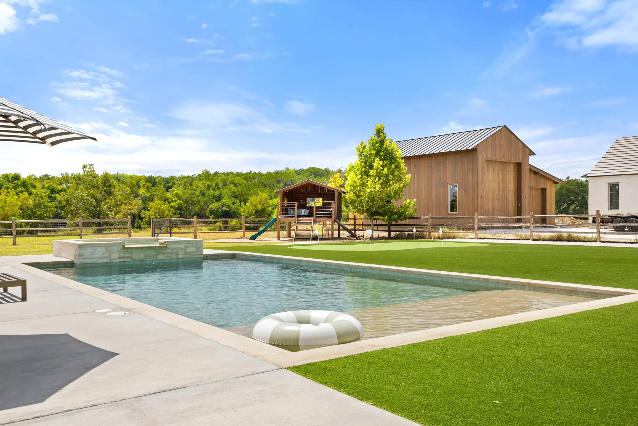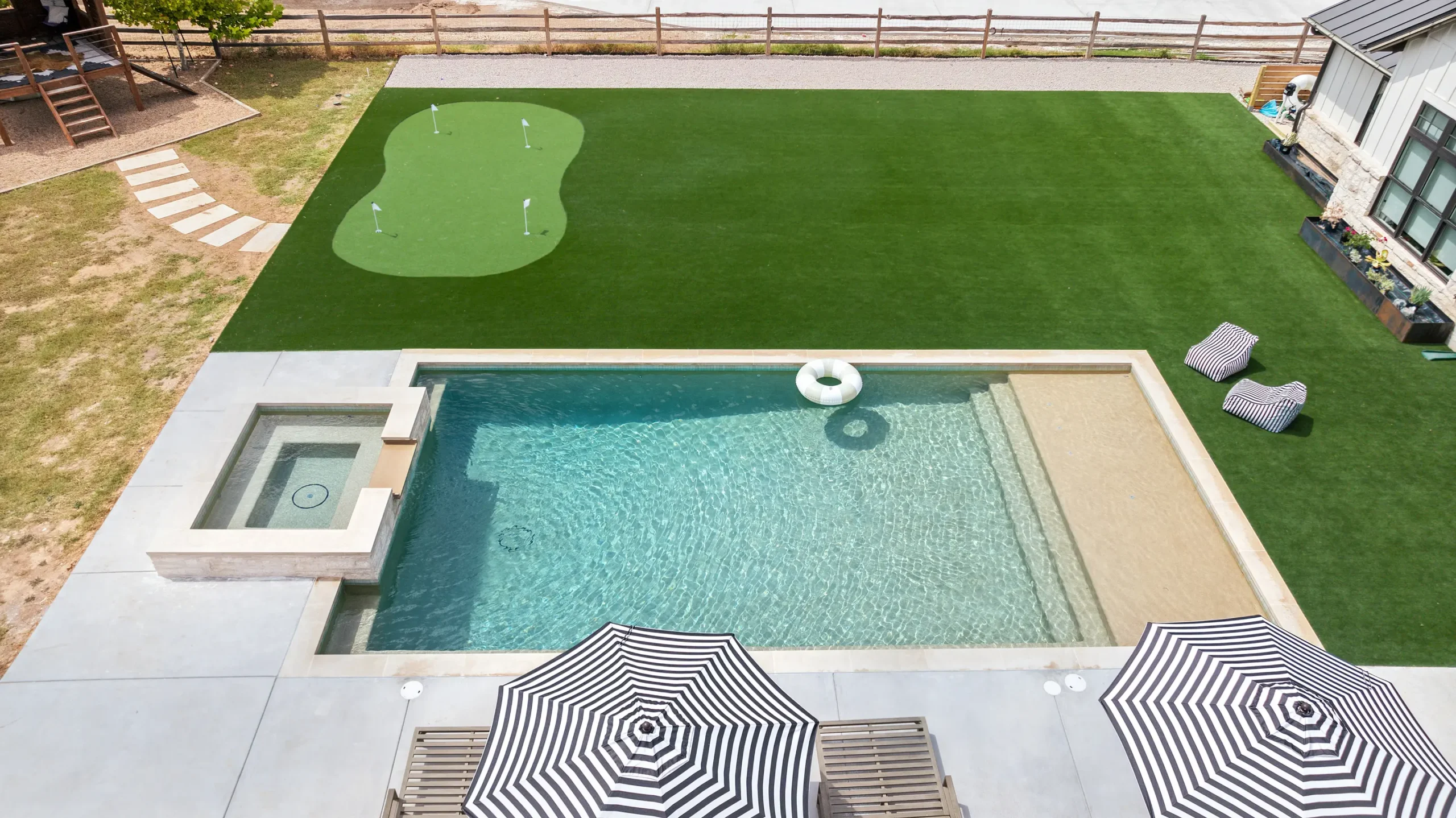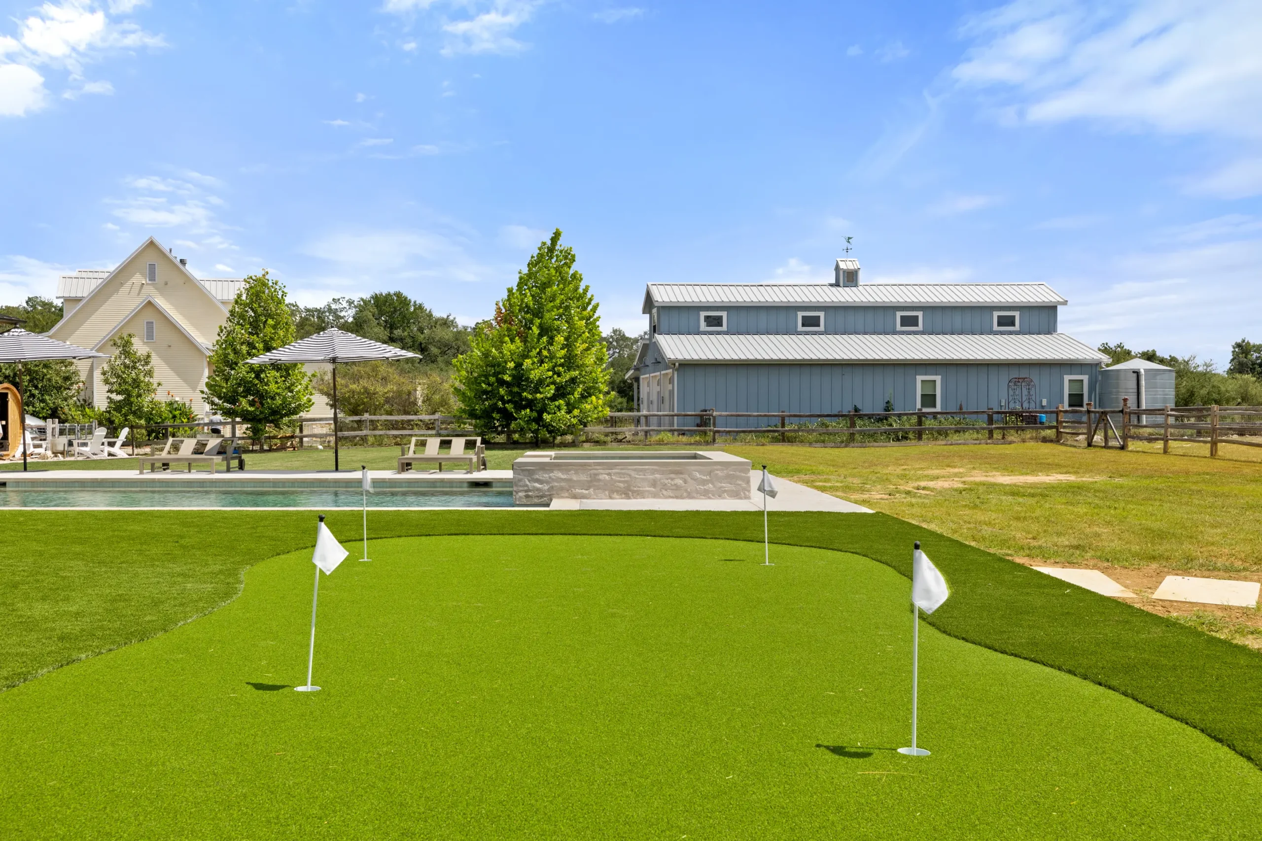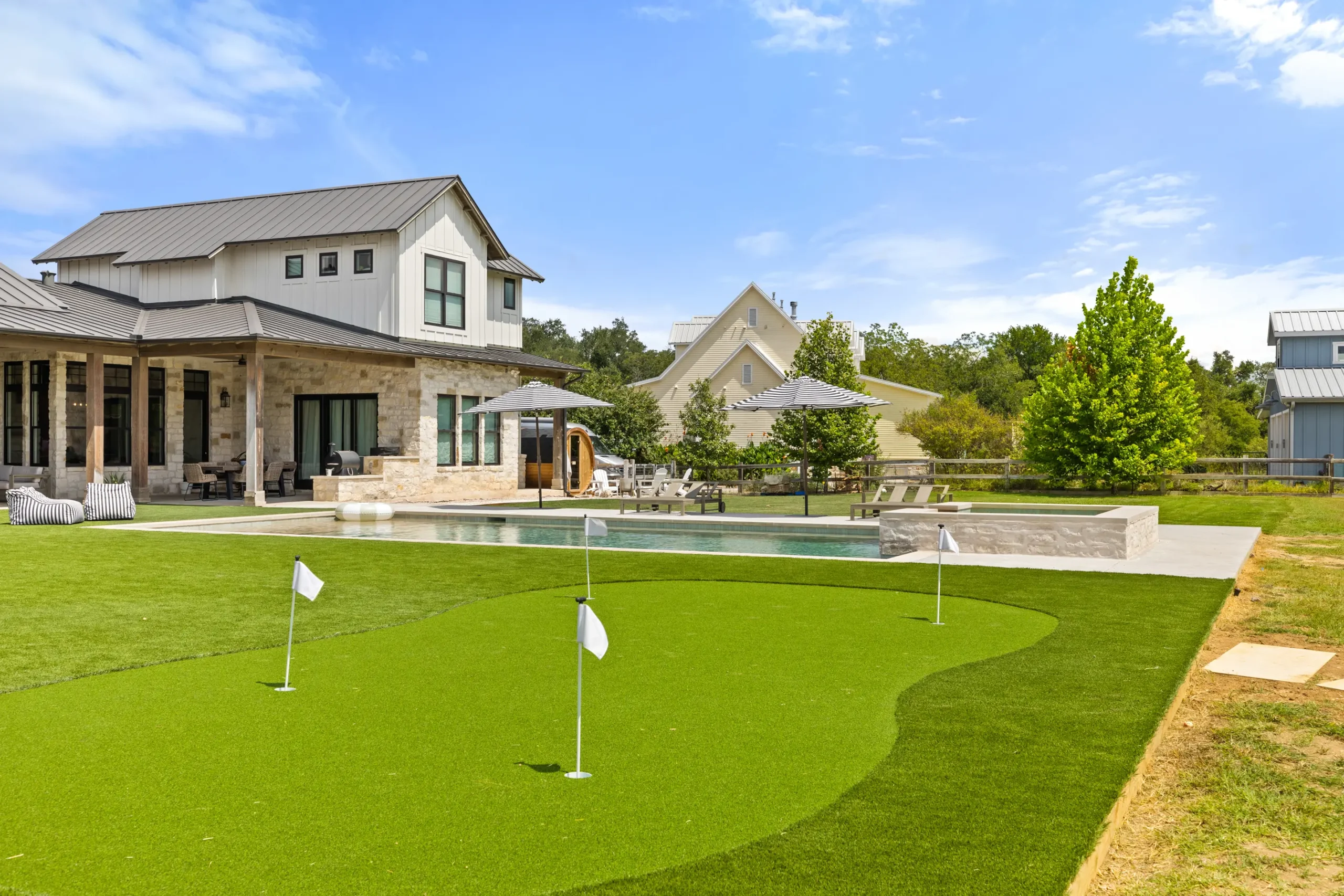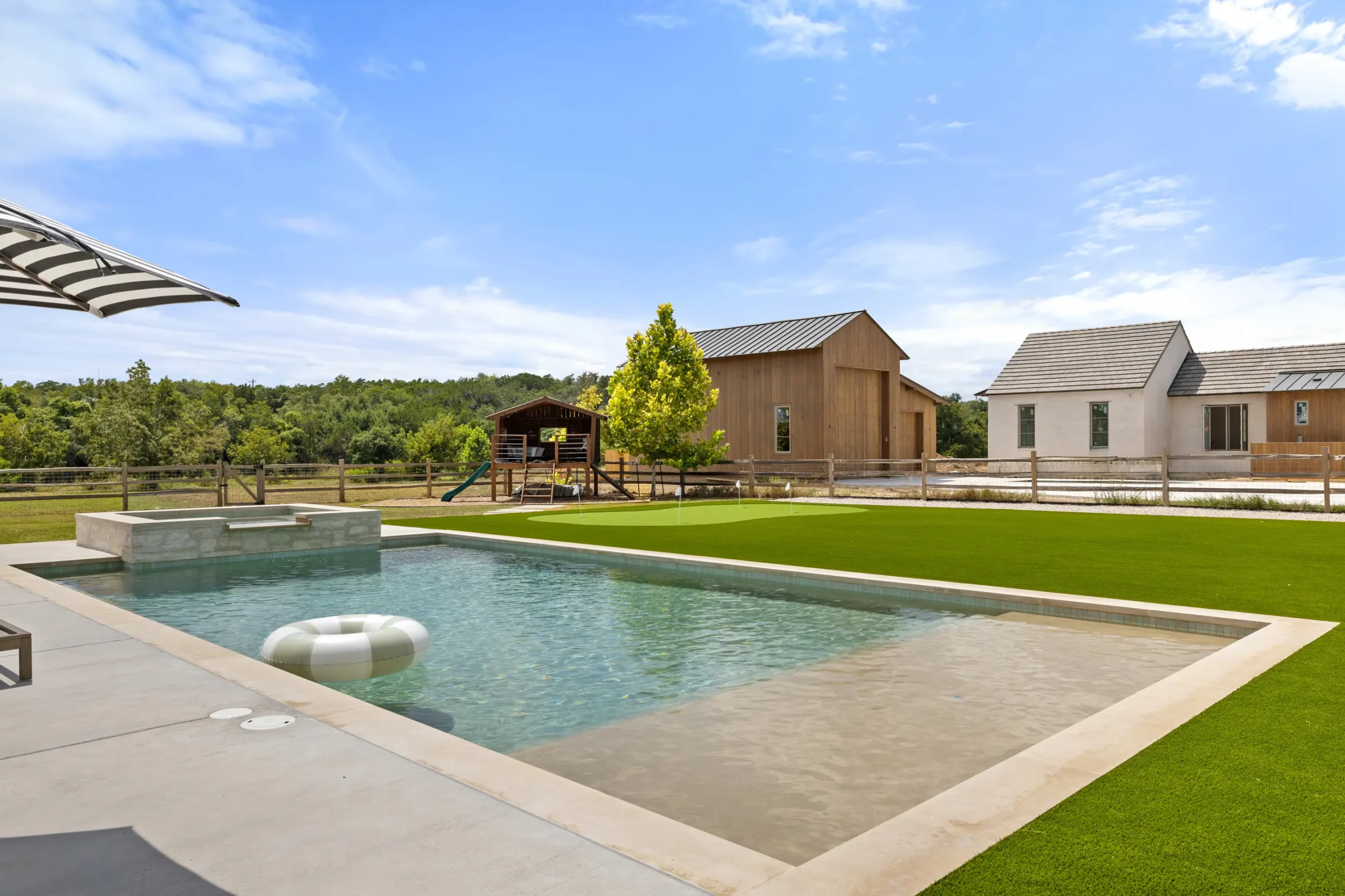 Game on. Fairway Court blends sleek geometry with modern luxury—complete with a spa, wide tanning ledge, and built-in lounge areas. Beyond the water, a putting green and basketball court turn this backyard into a full-on playground for both relaxation and play.