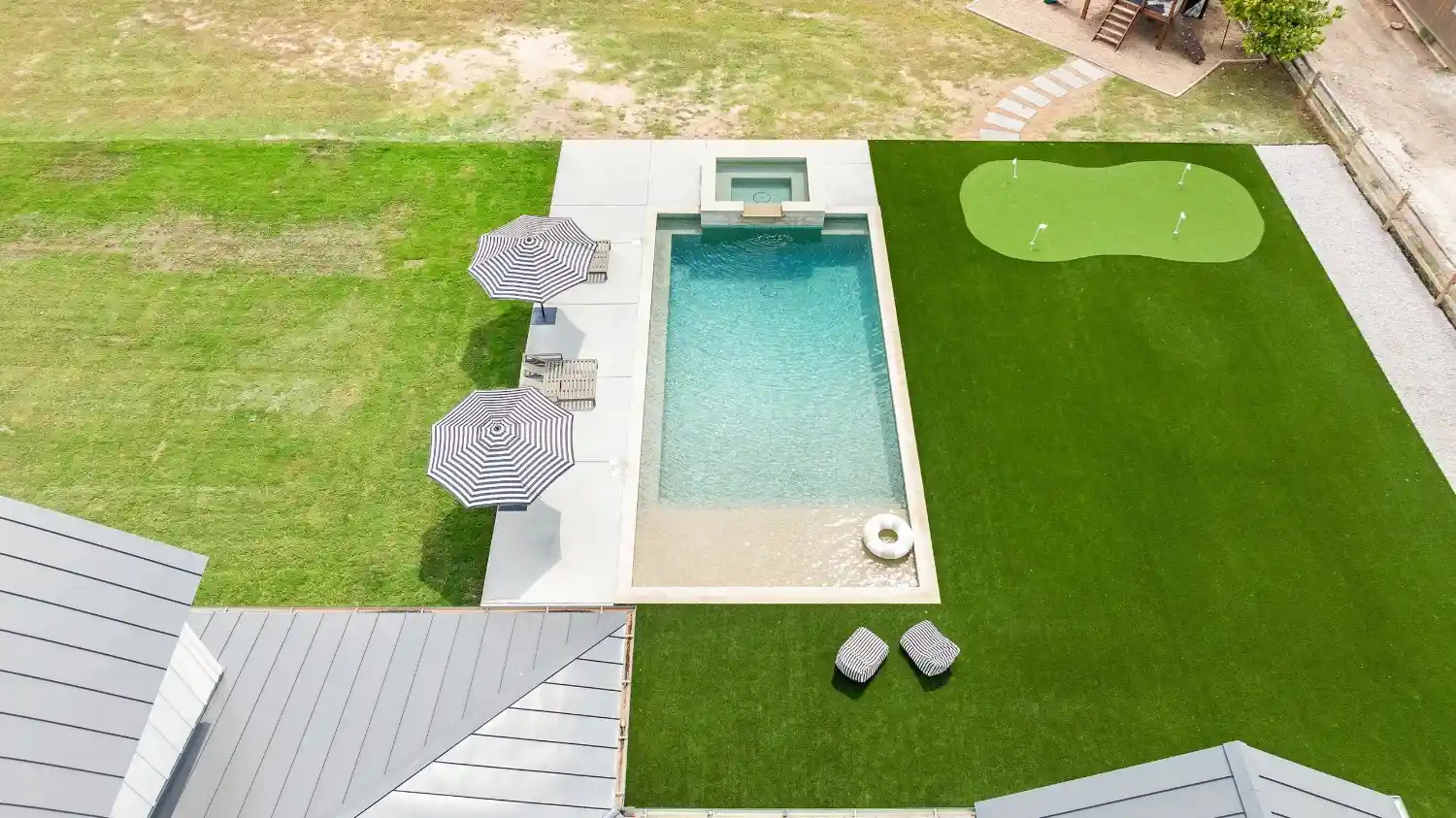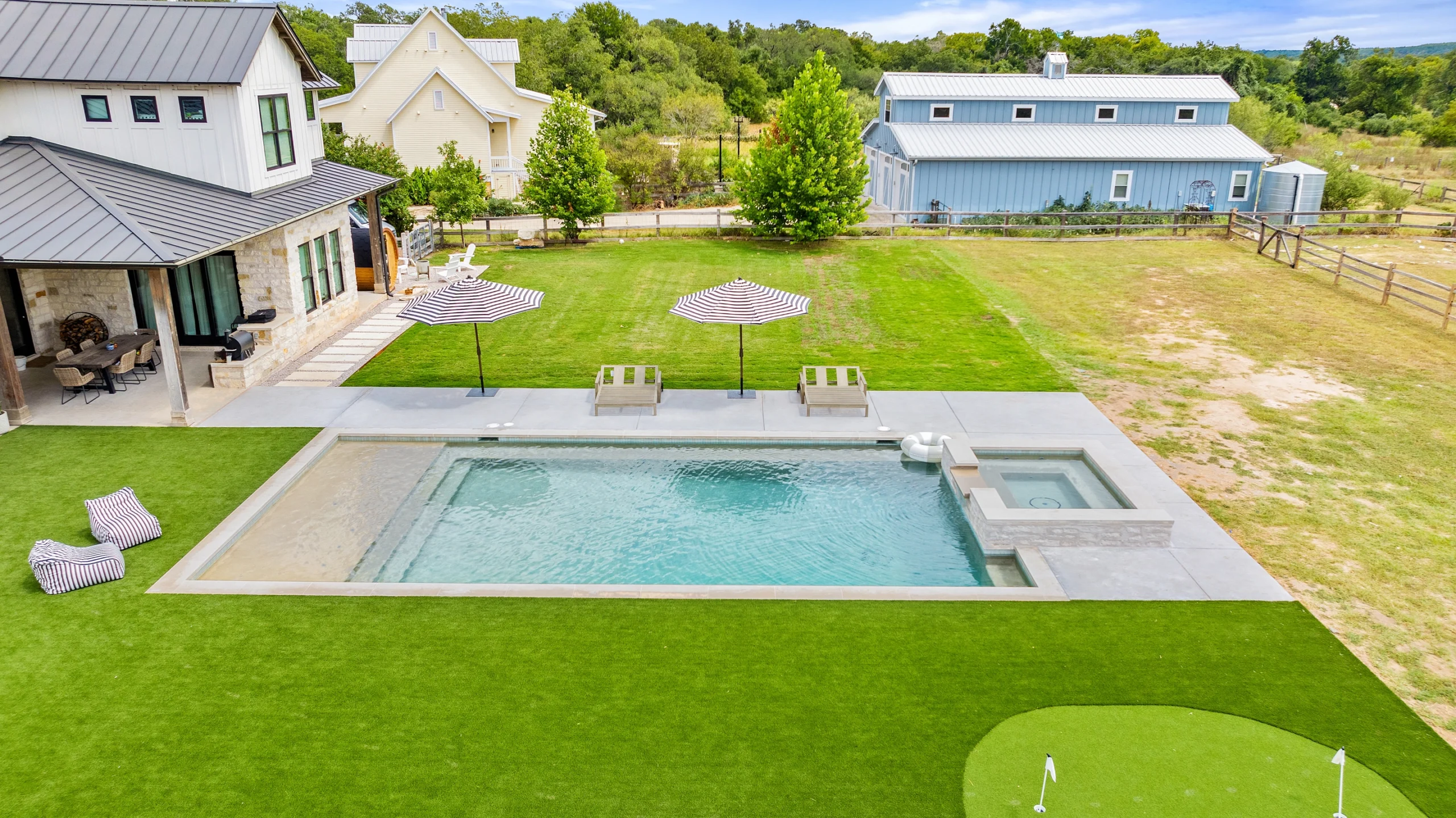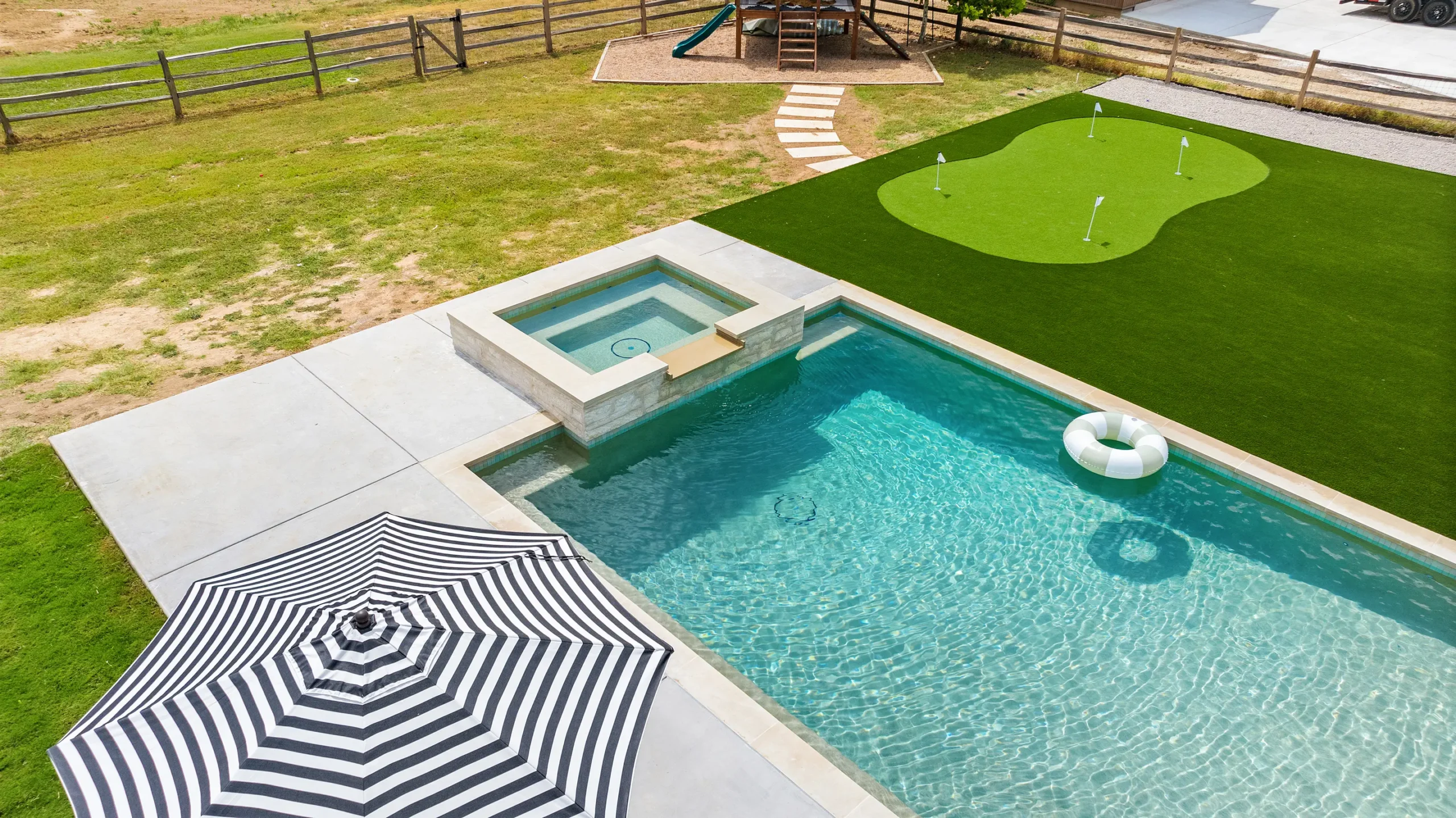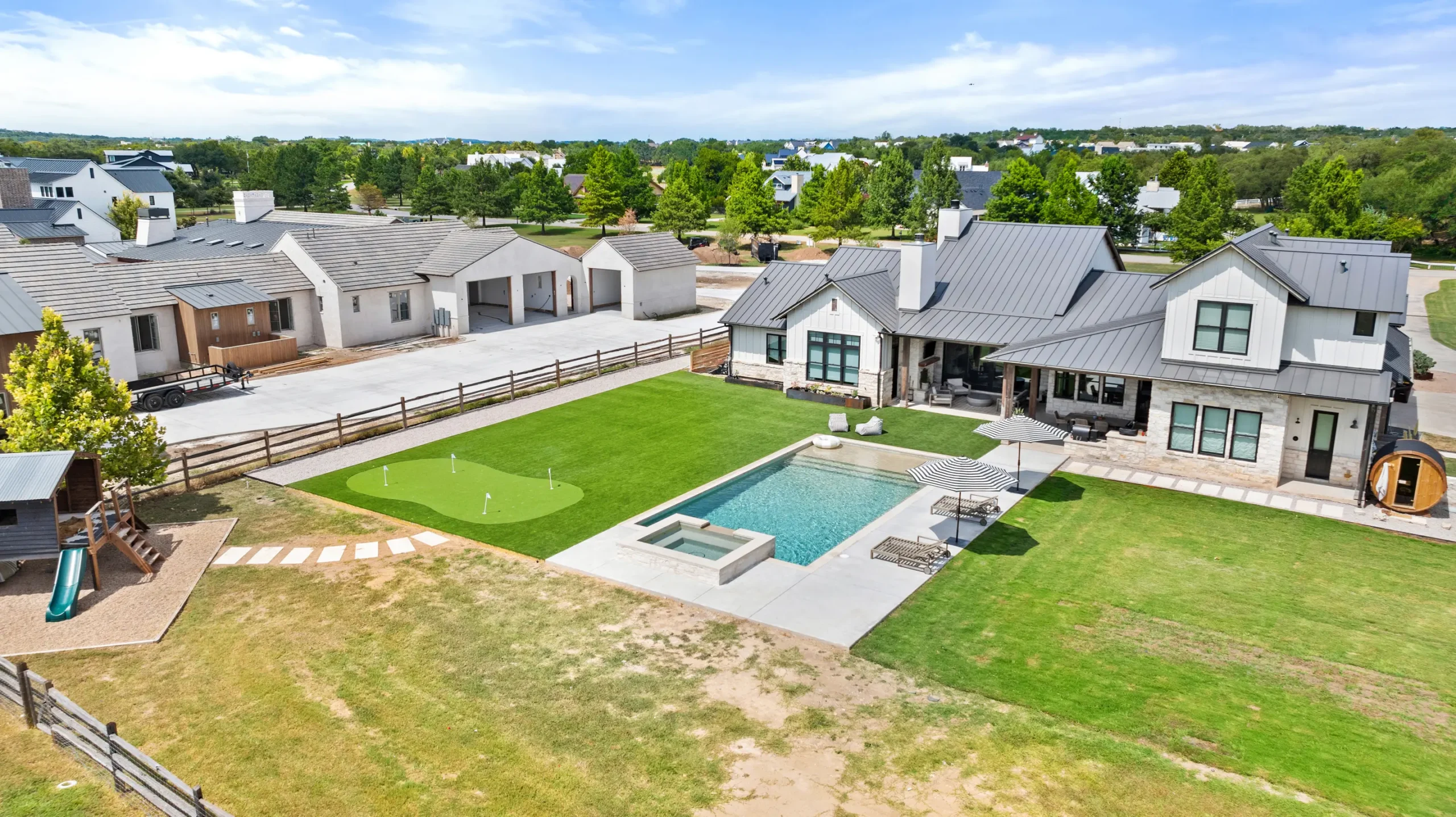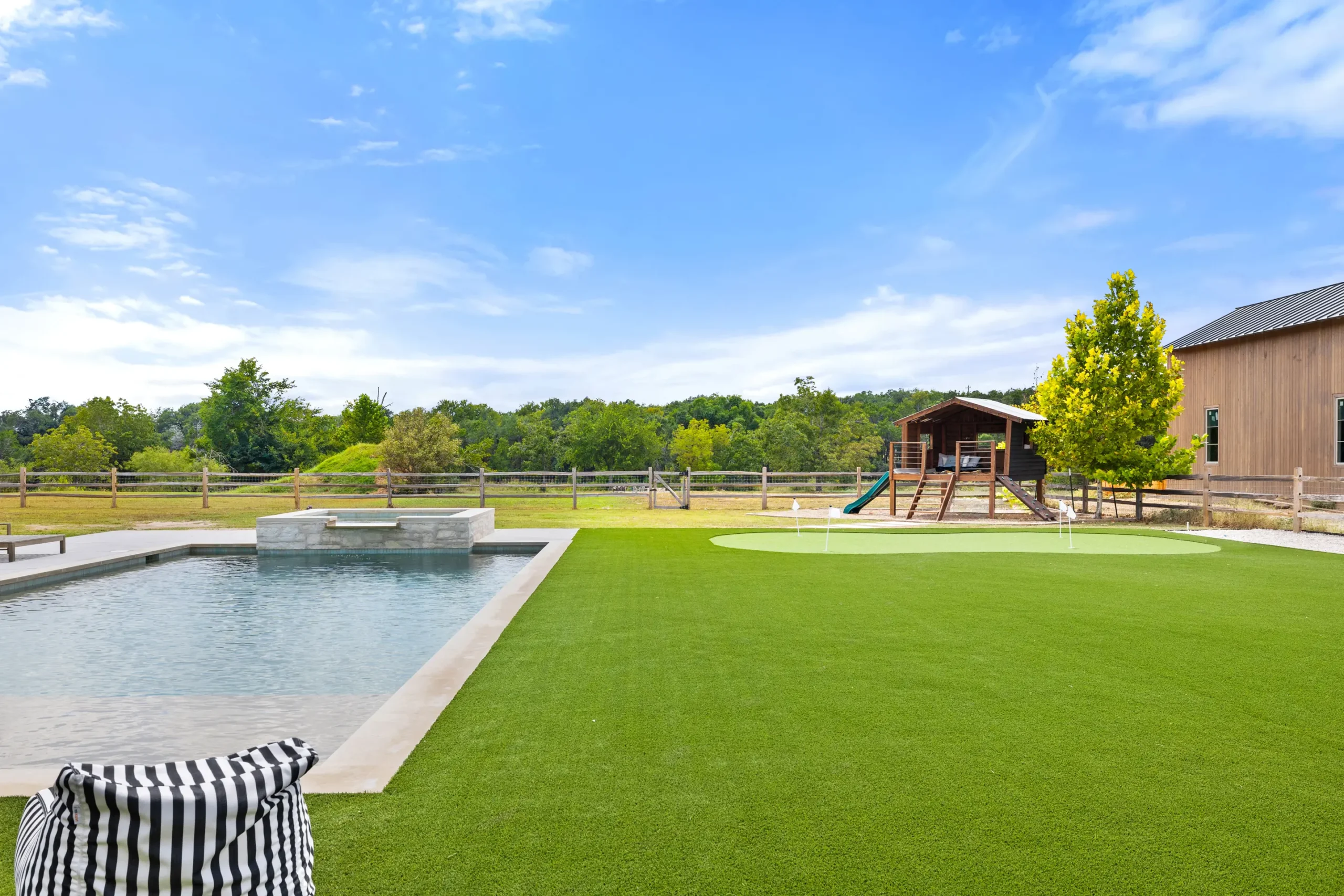 Game on. Fairway Court blends sleek geometry with modern luxury—complete with a spa, wide tanning ledge, and built-in lounge areas. Beyond the water, a putting green and basketball court turn this backyard into a full-on playground for both relaxation and play.