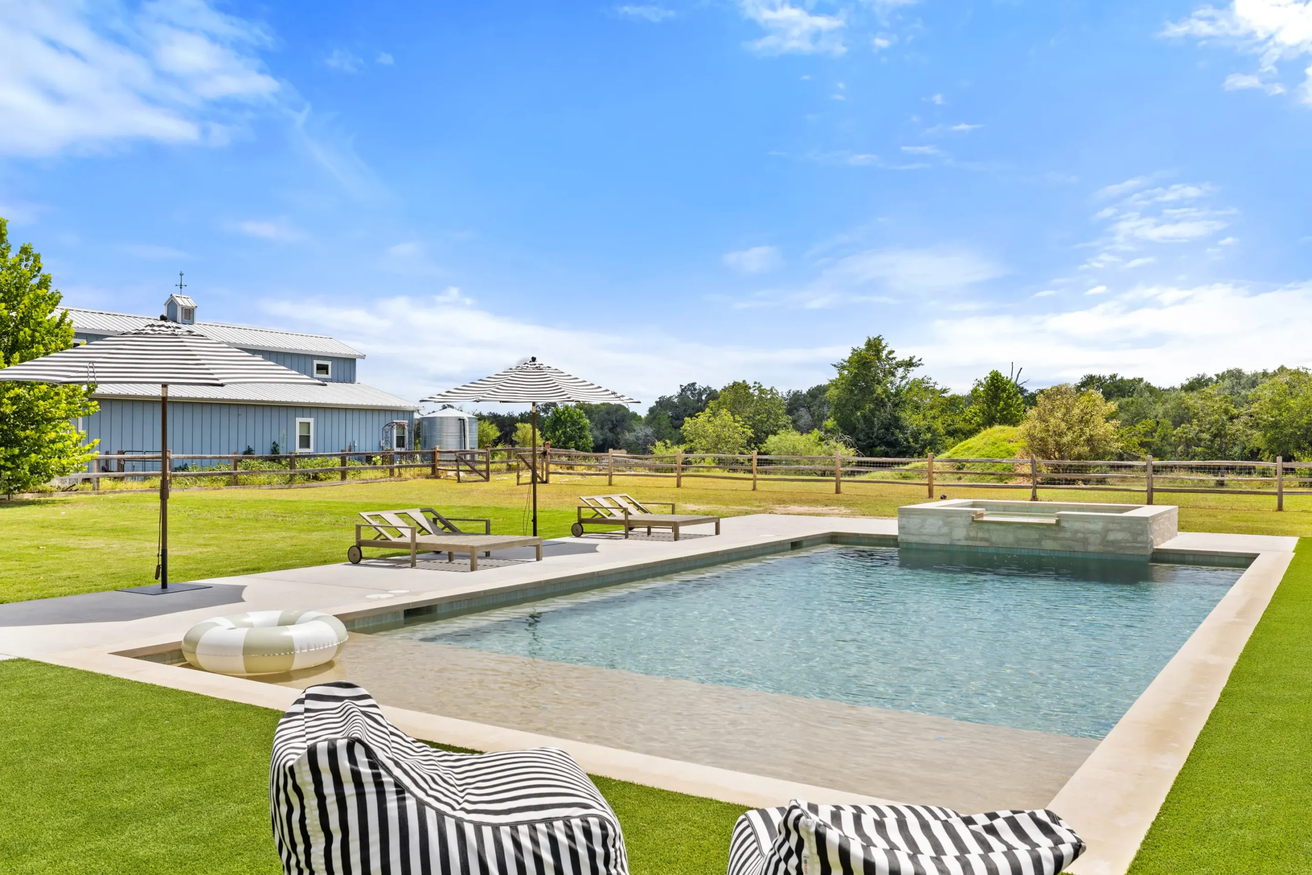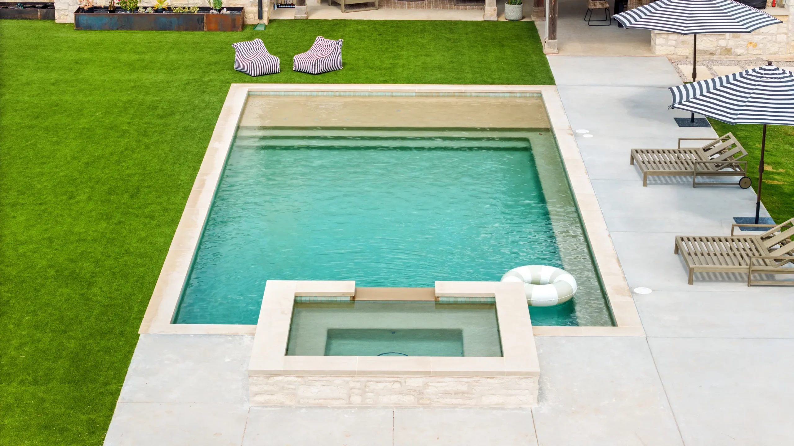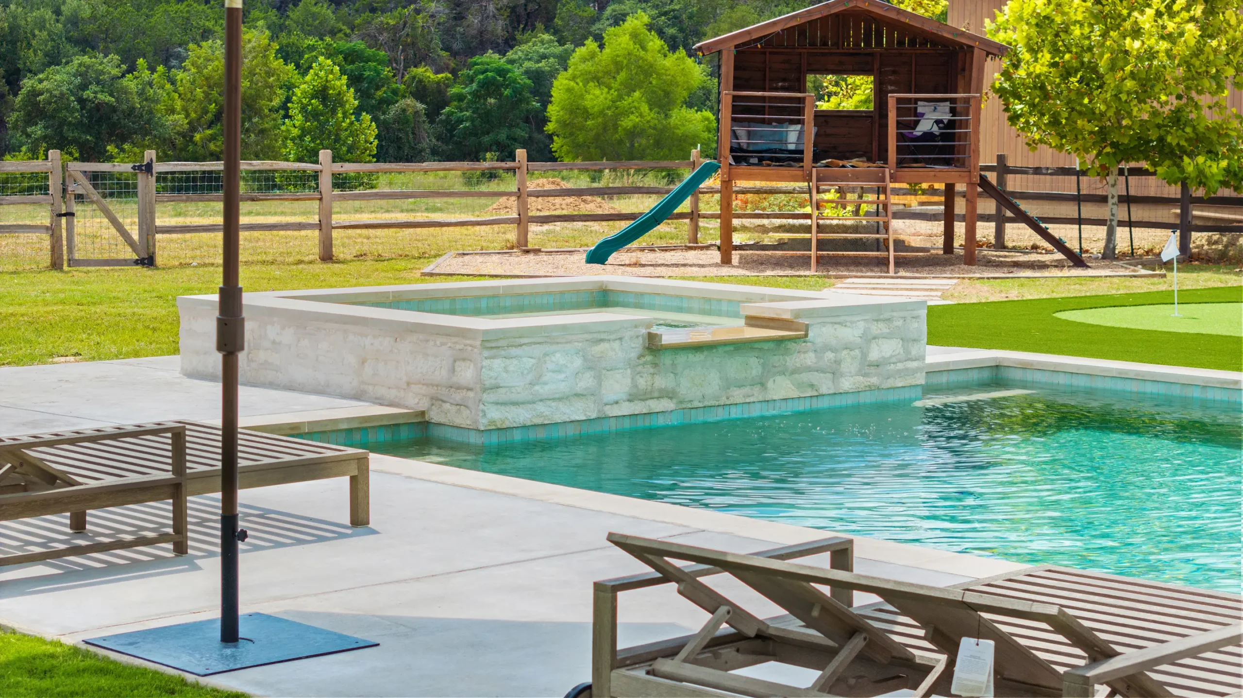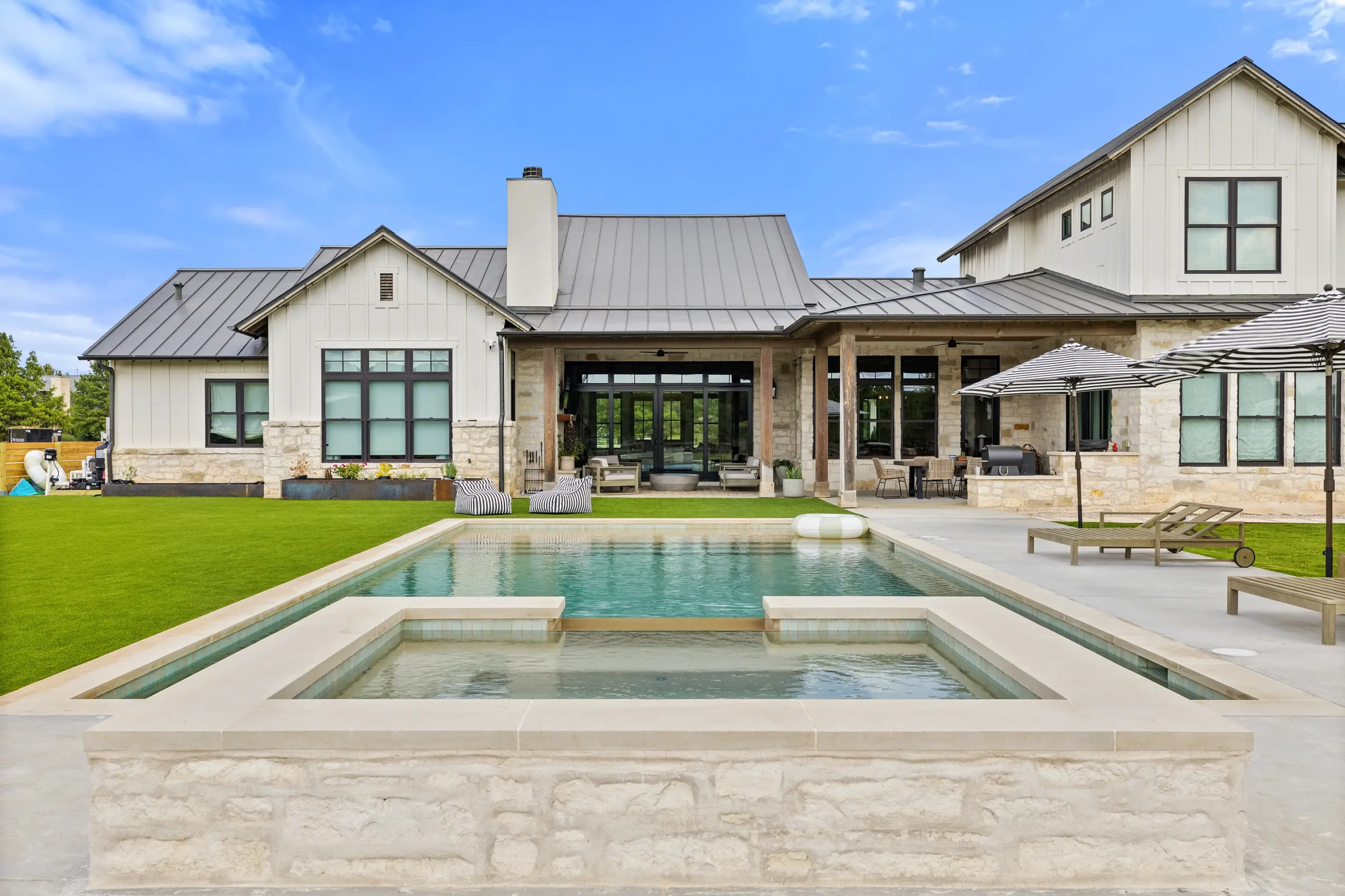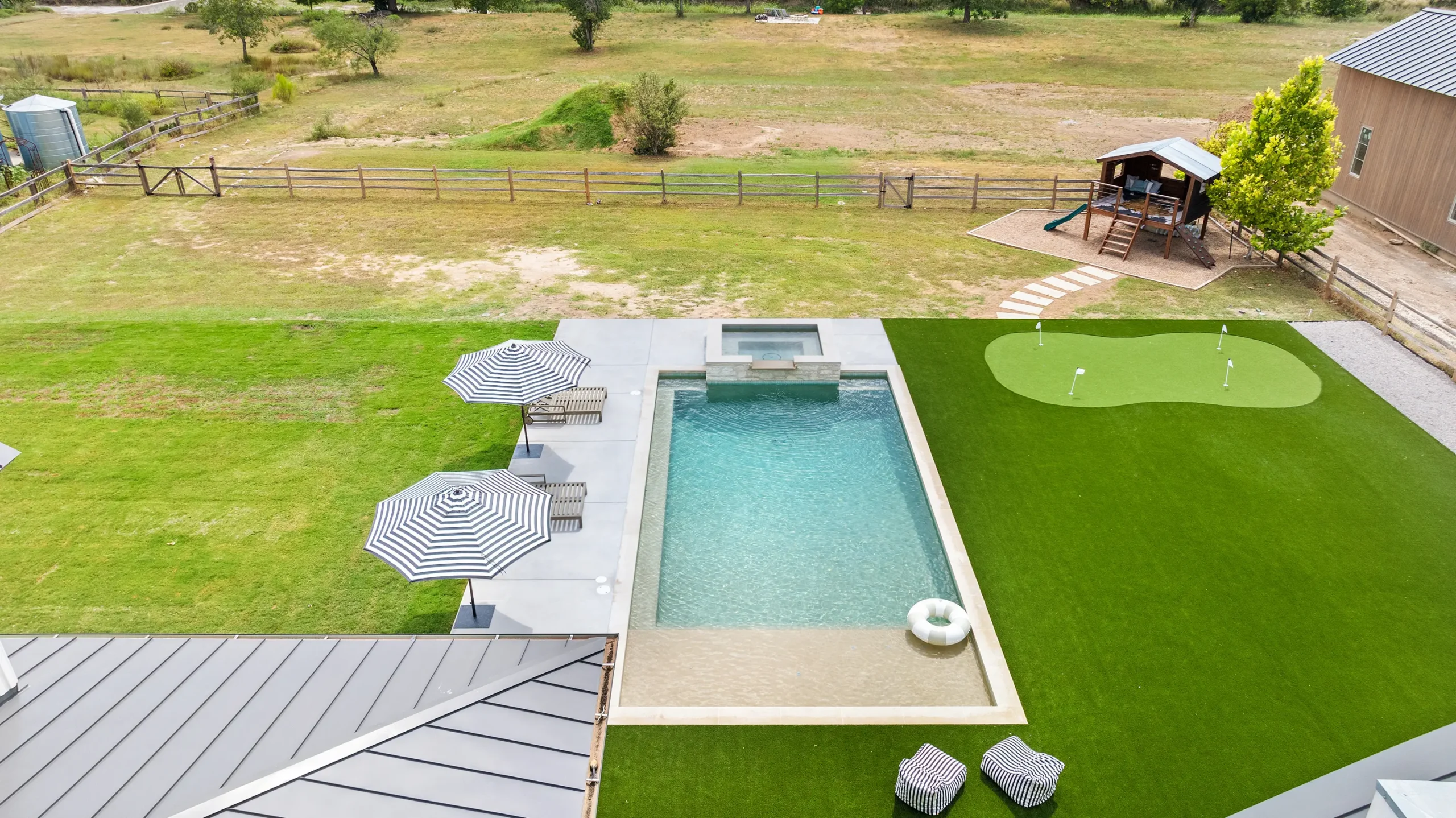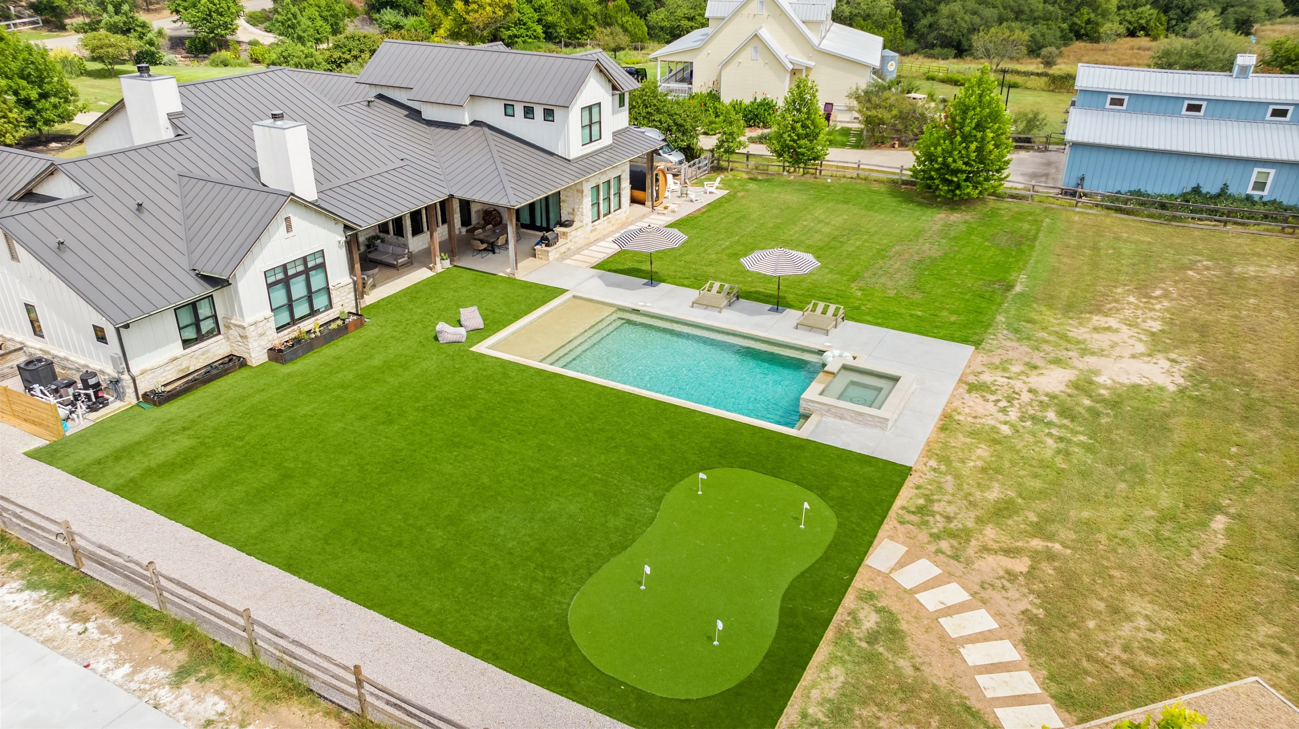 Game on. Fairway Court blends sleek geometry with modern luxury—complete with a spa, wide tanning ledge, and built-in lounge areas. Beyond the water, a putting green and basketball court turn this backyard into a full-on playground for both relaxation and play.