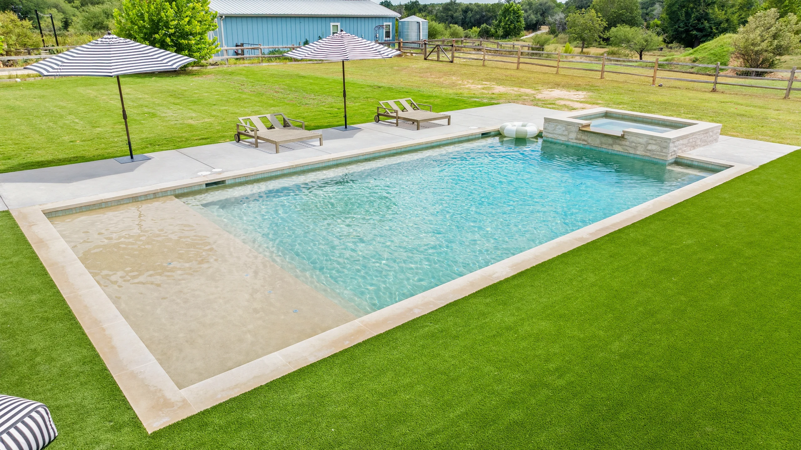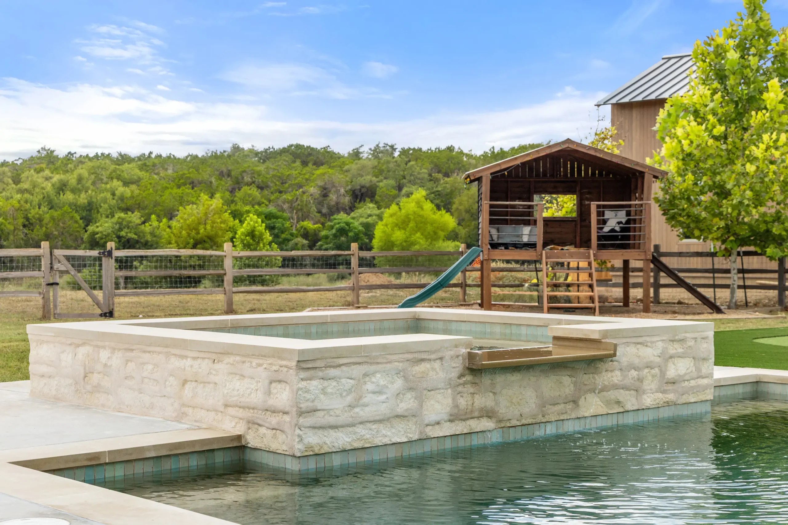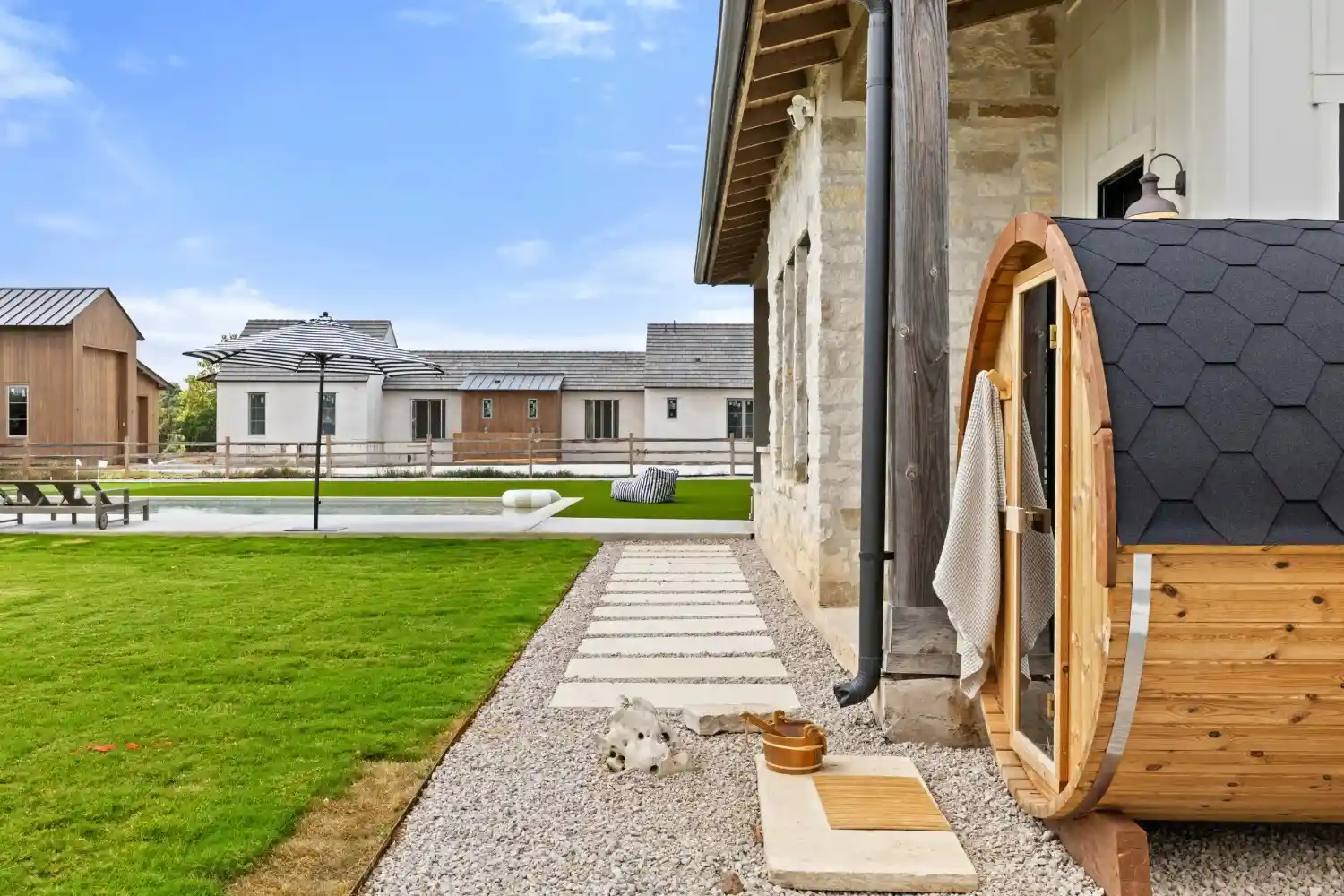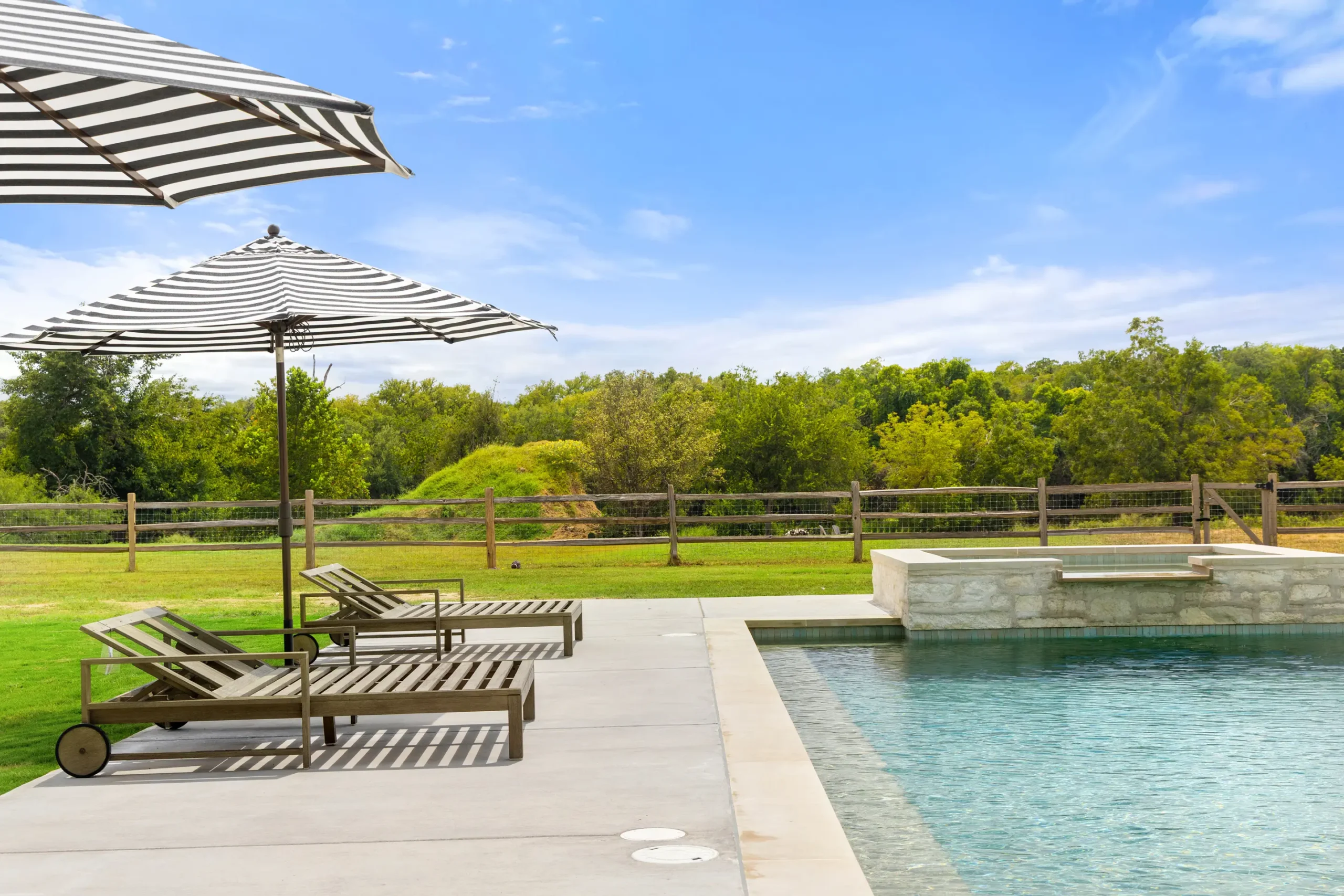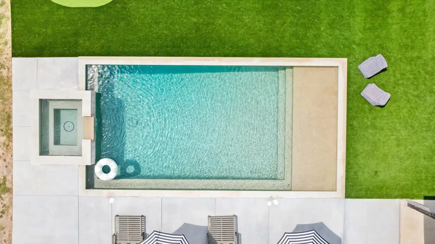 Game on. Fairway Court blends sleek geometry with modern luxury—complete with a spa, wide tanning ledge, and built-in lounge areas. Beyond the water, a putting green and basketball court turn this backyard into a full-on playground for both relaxation and play.