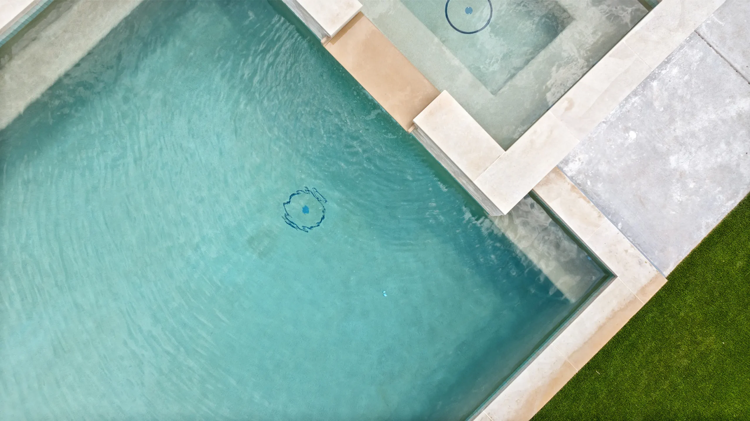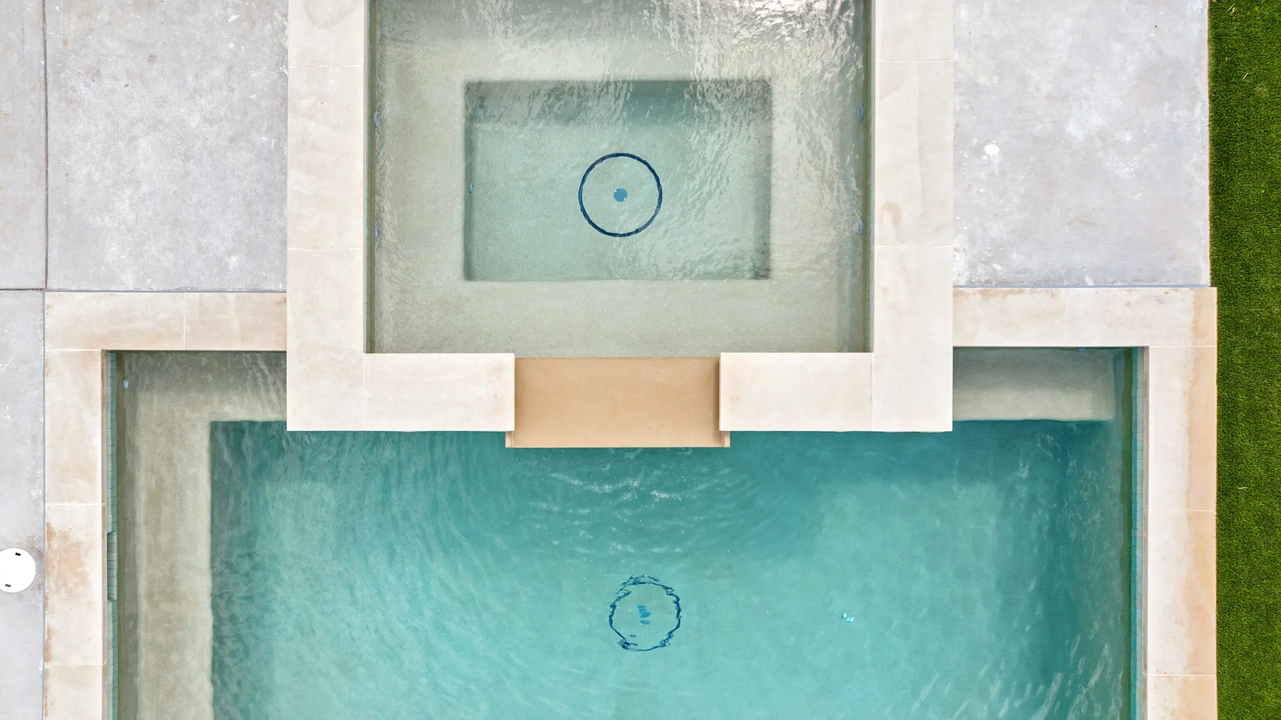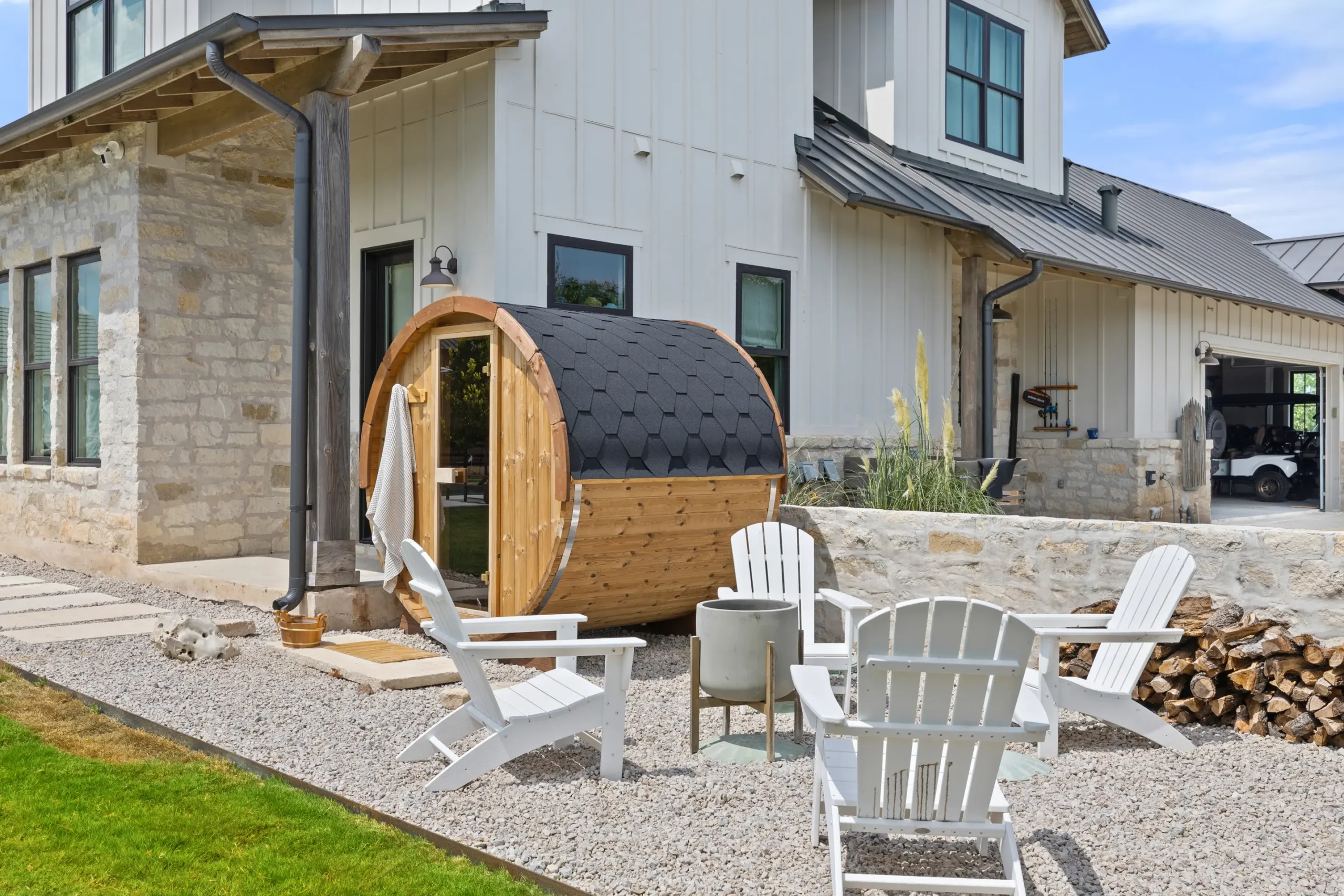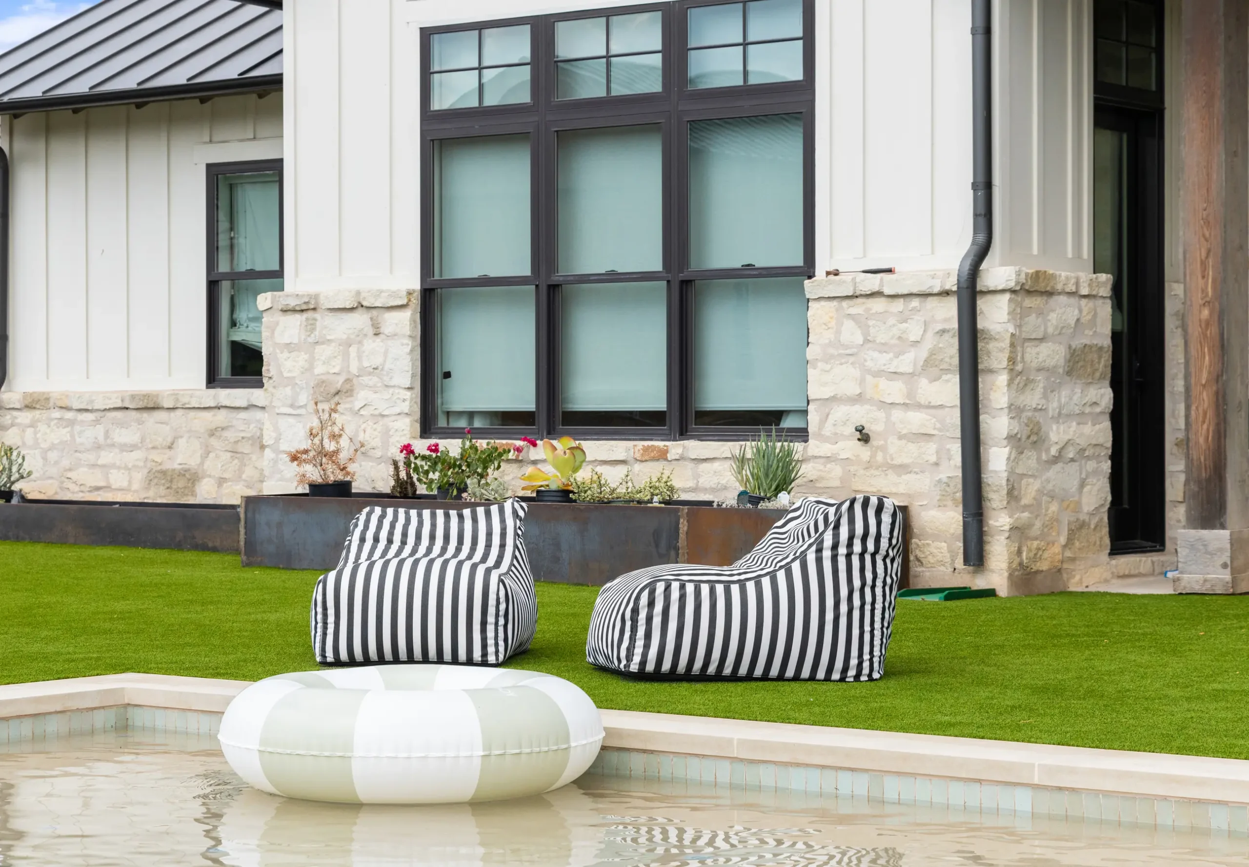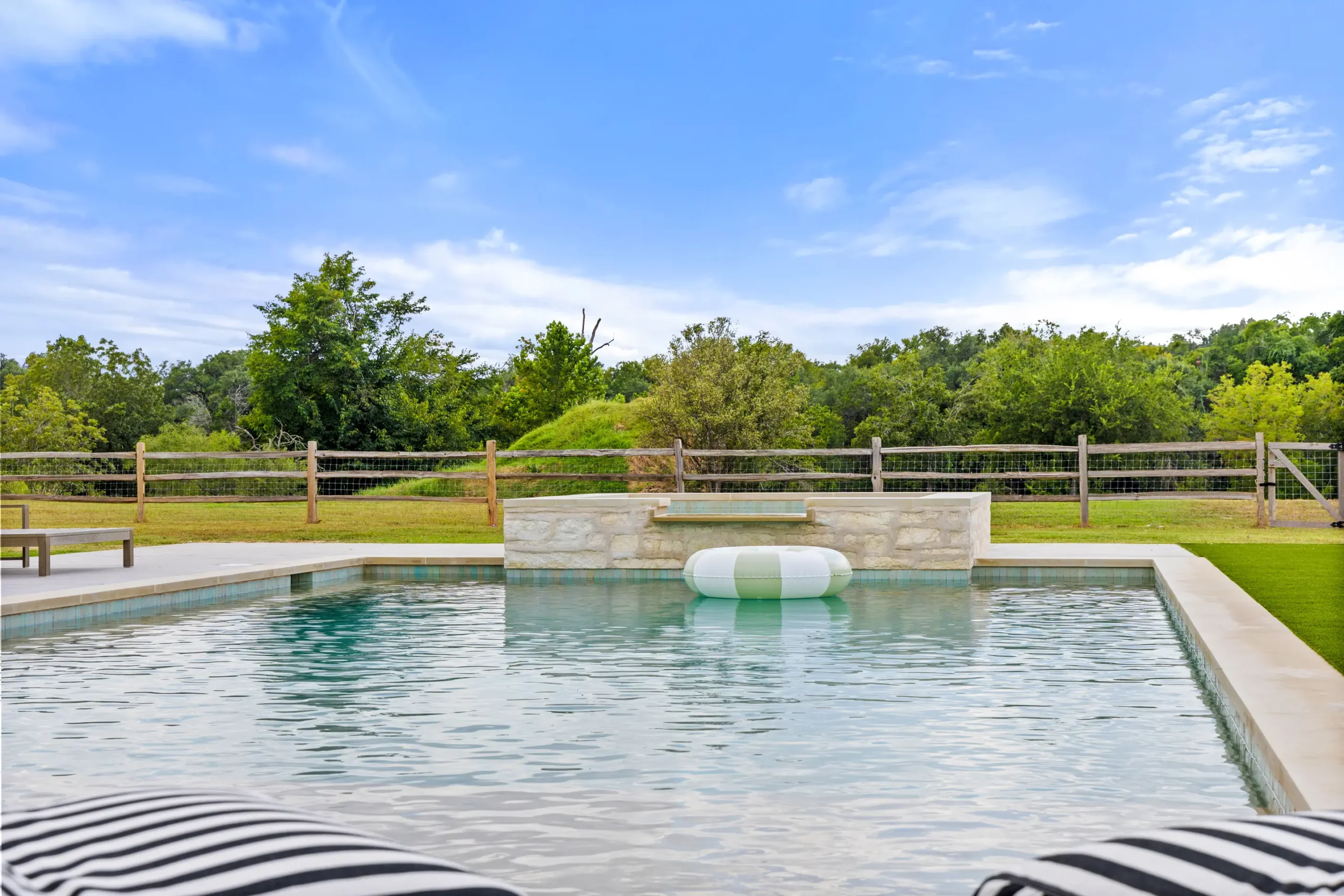 Game on. Fairway Court blends sleek geometry with modern luxury—complete with a spa, wide tanning ledge, and built-in lounge areas. Beyond the water, a putting green and basketball court turn this backyard into a full-on playground for both relaxation and play.