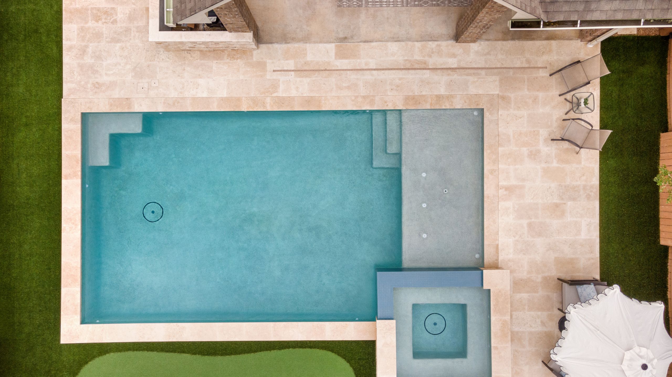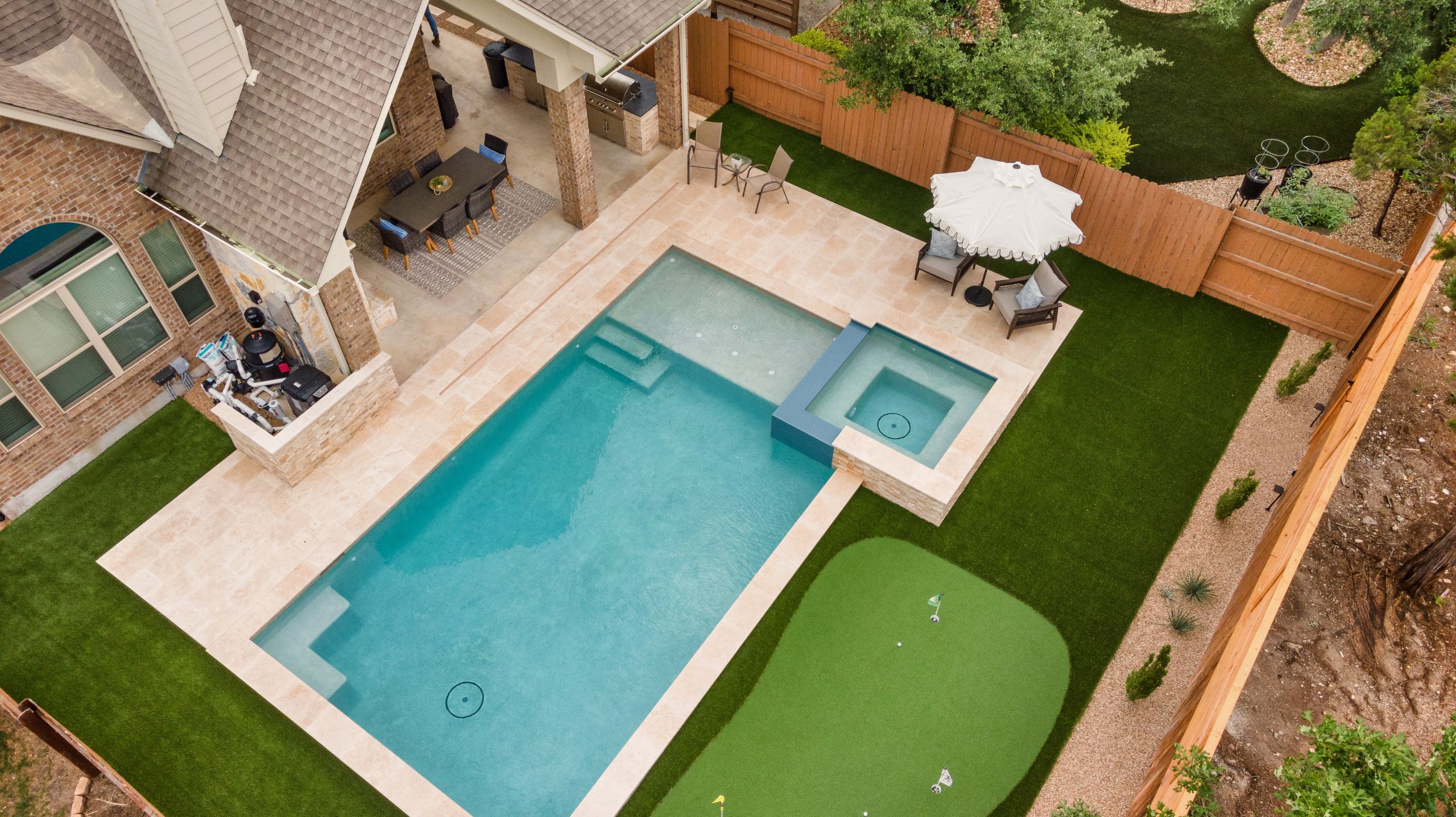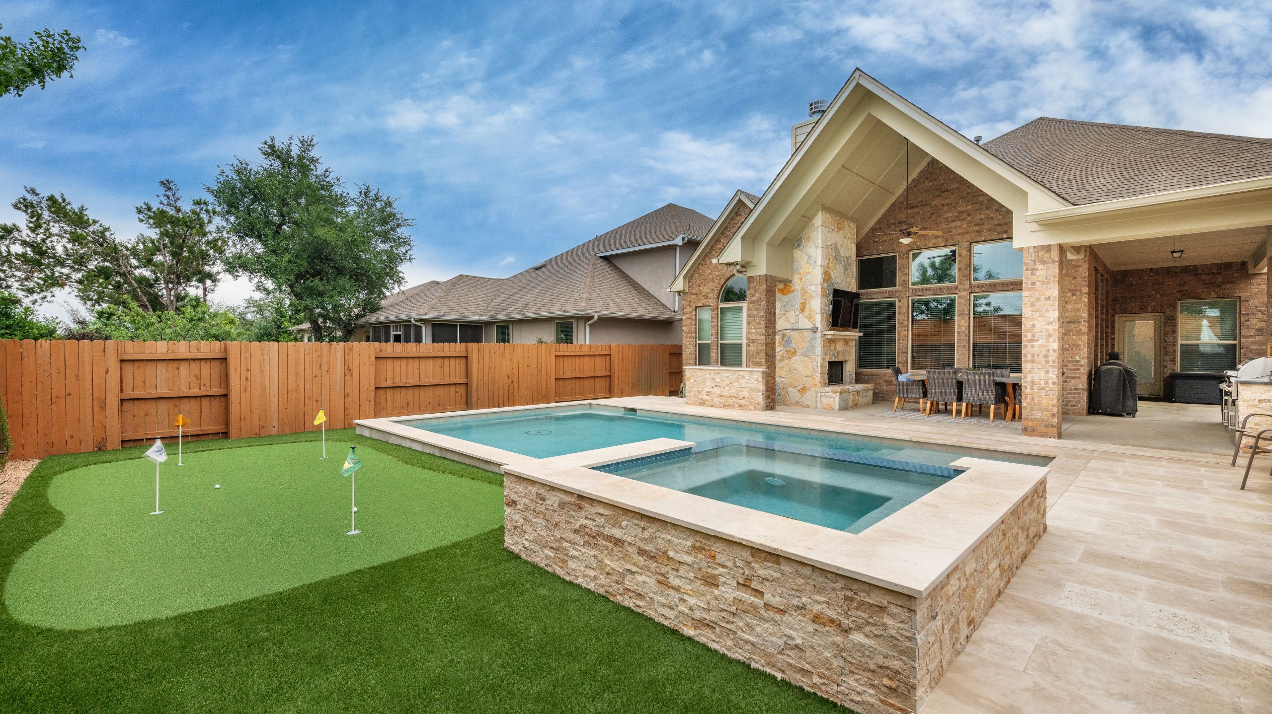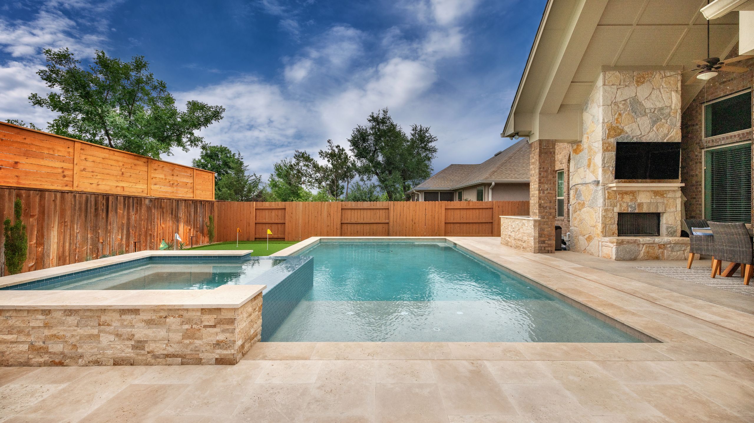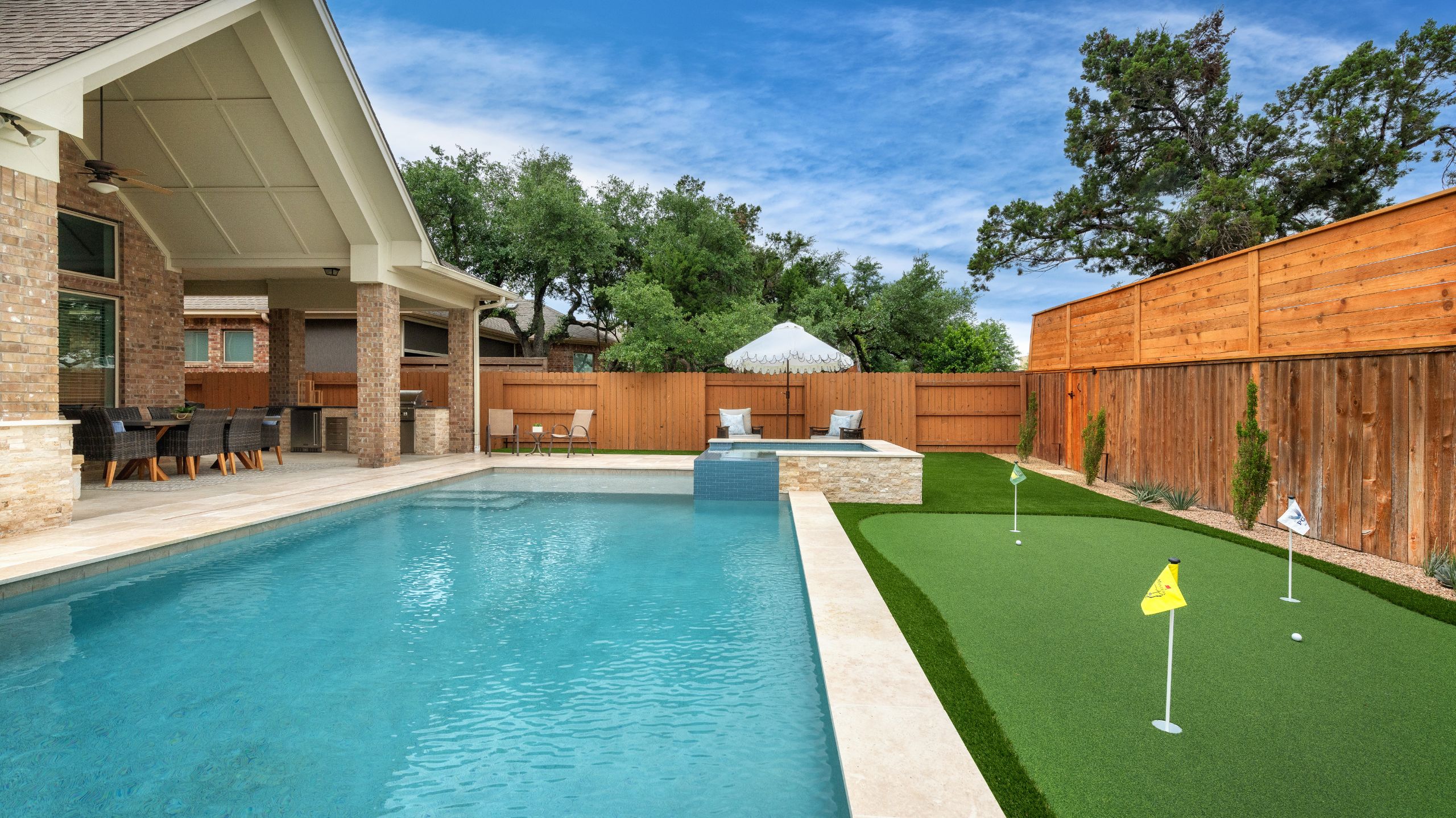 Luxury meets play with this pool and putting green combo. Dive in and tee off! A crisp geometric design anchors the space, paired with a sun shelf for lounging, a raised spa for soaking, and a putting green just steps away. Whether you're working on your short game or winding down in the water, it's backyard living at its best.