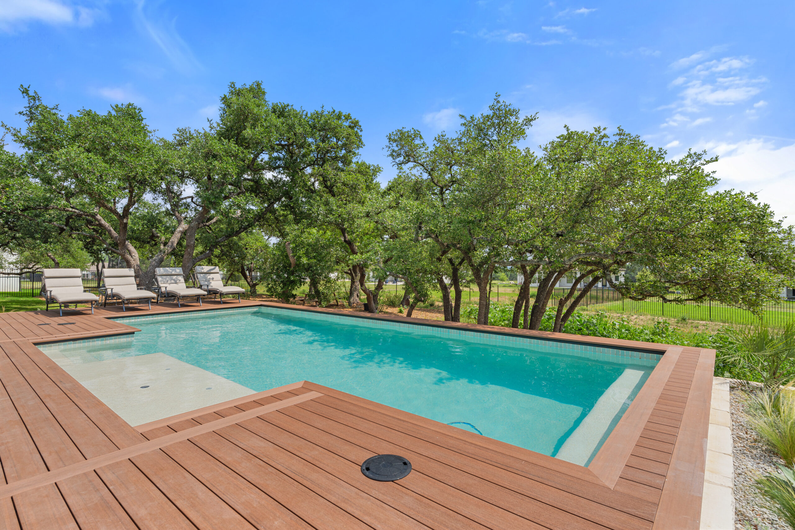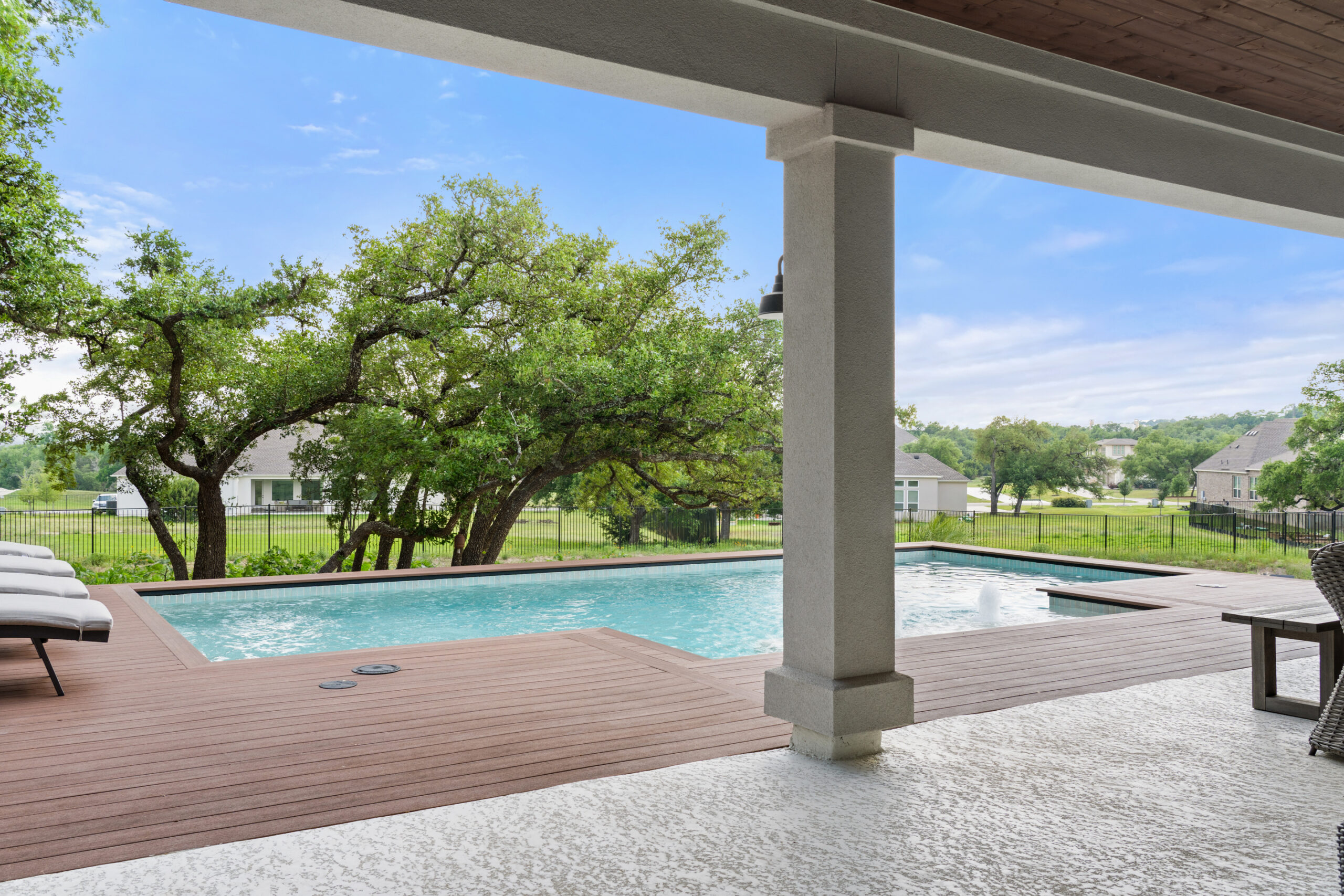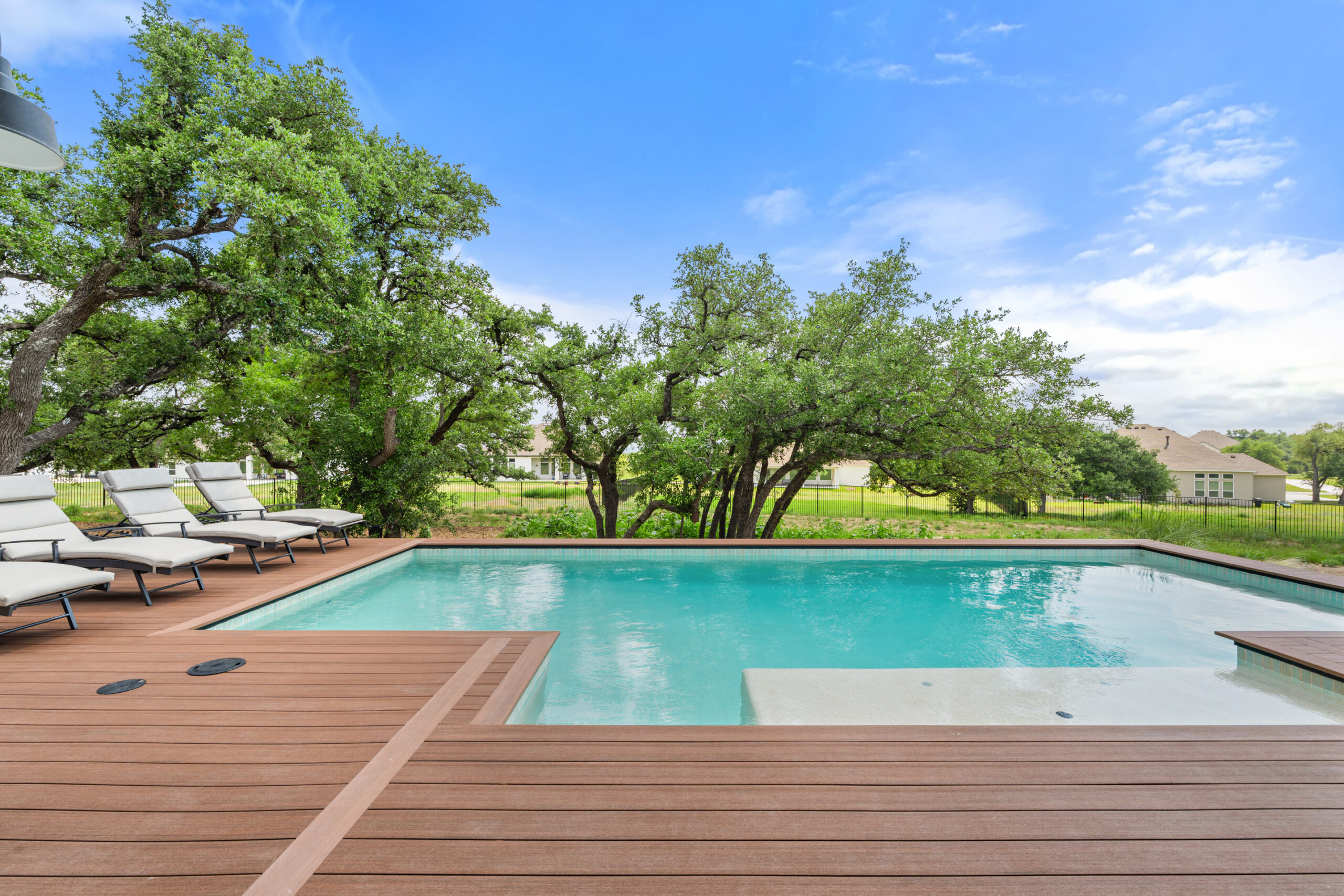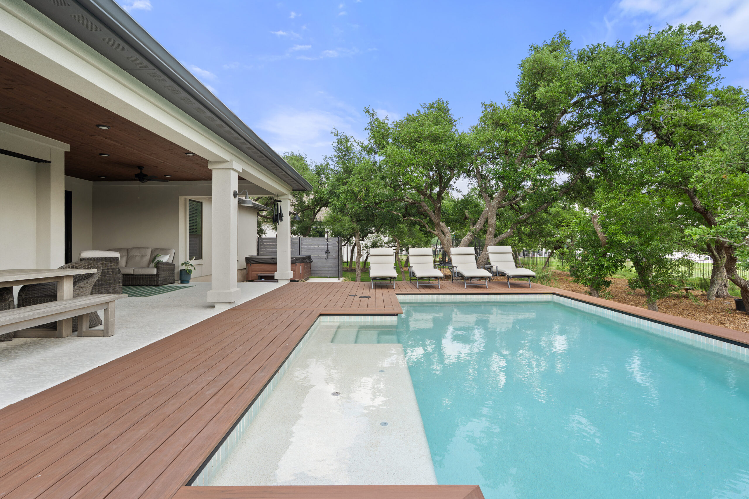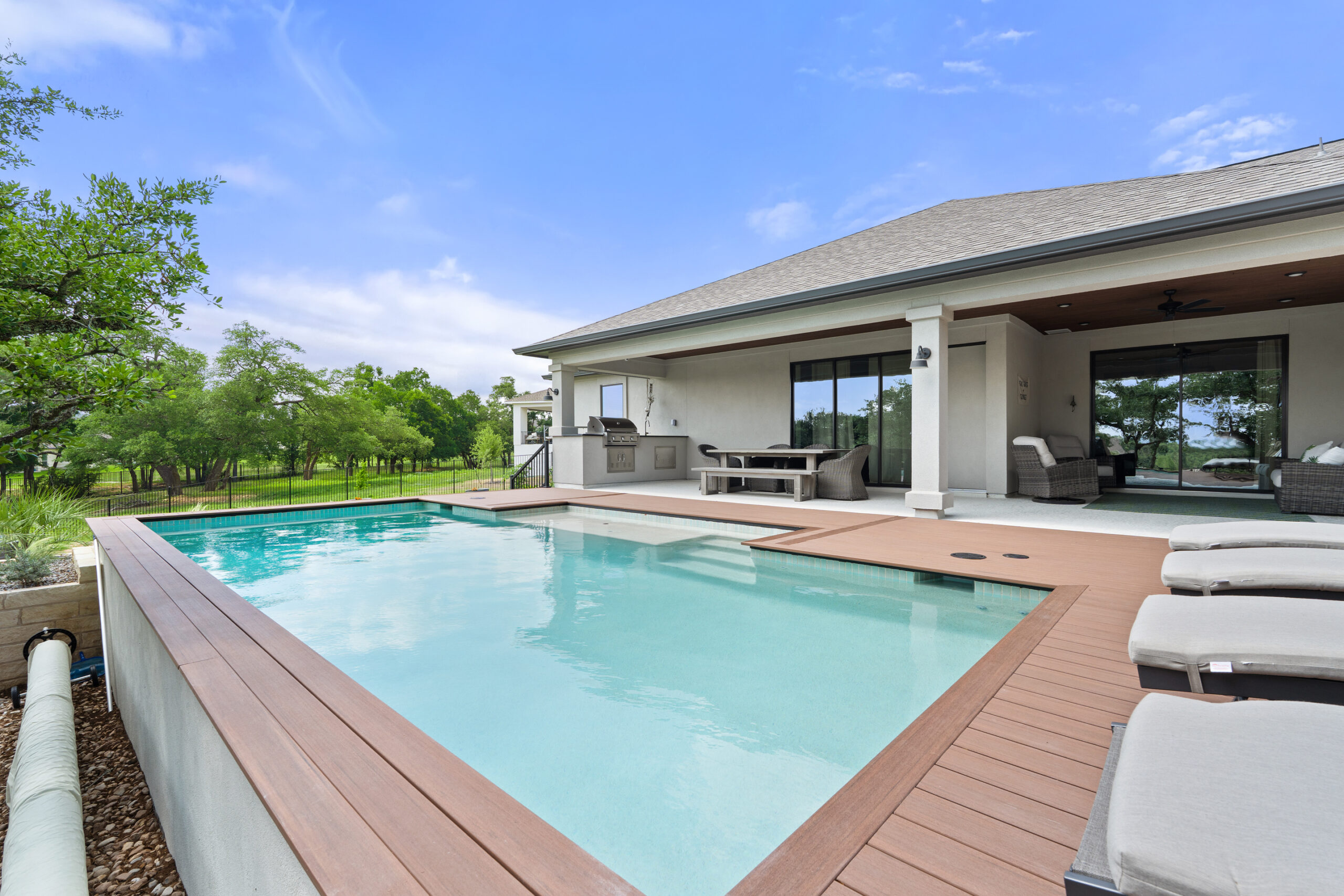 Bright blue water, a custom raised deck, and space made for slowing down and living it up. This custom build features clean lines, a built-in spa, outdoor shower, kitchen, and plenty of room to lounge—all surrounded by serene Hill Country views.