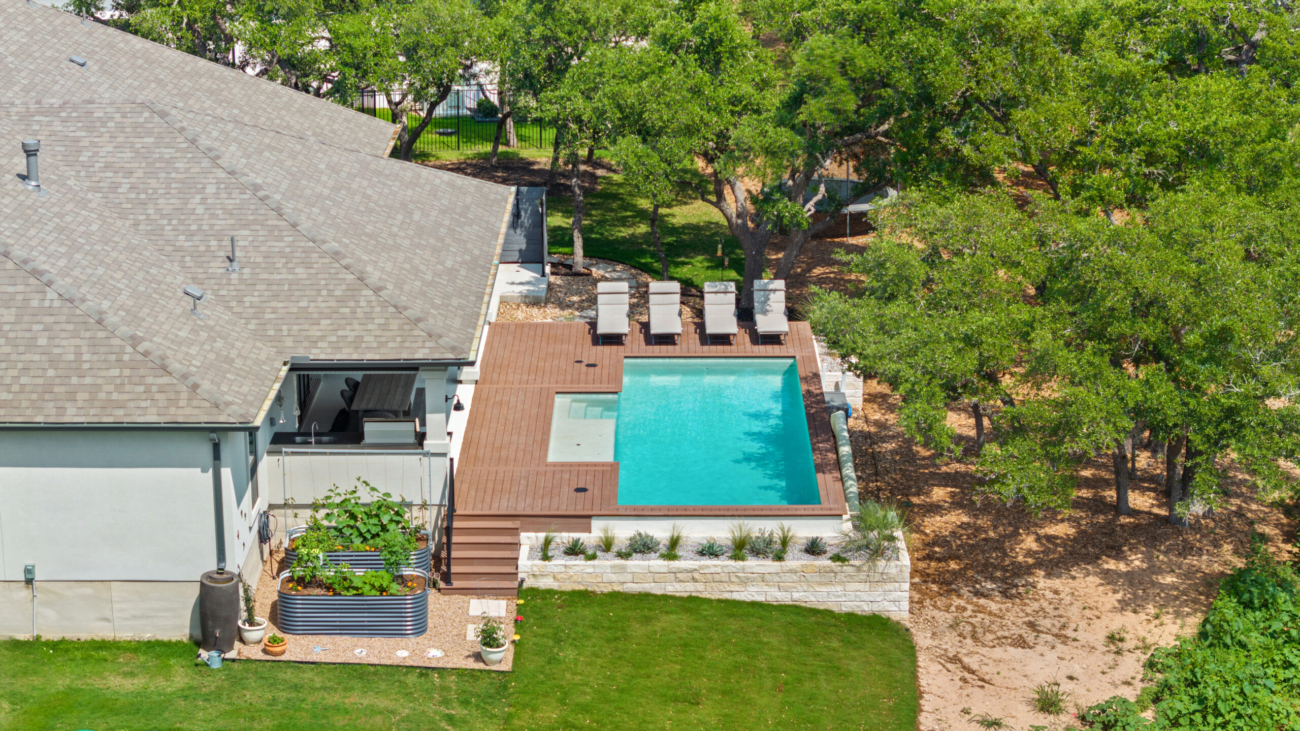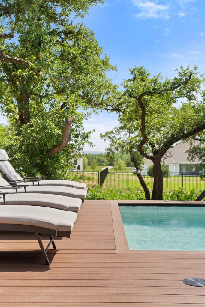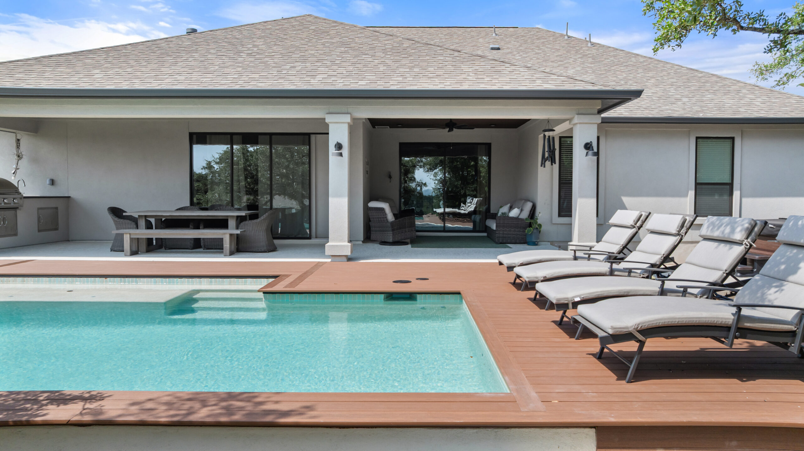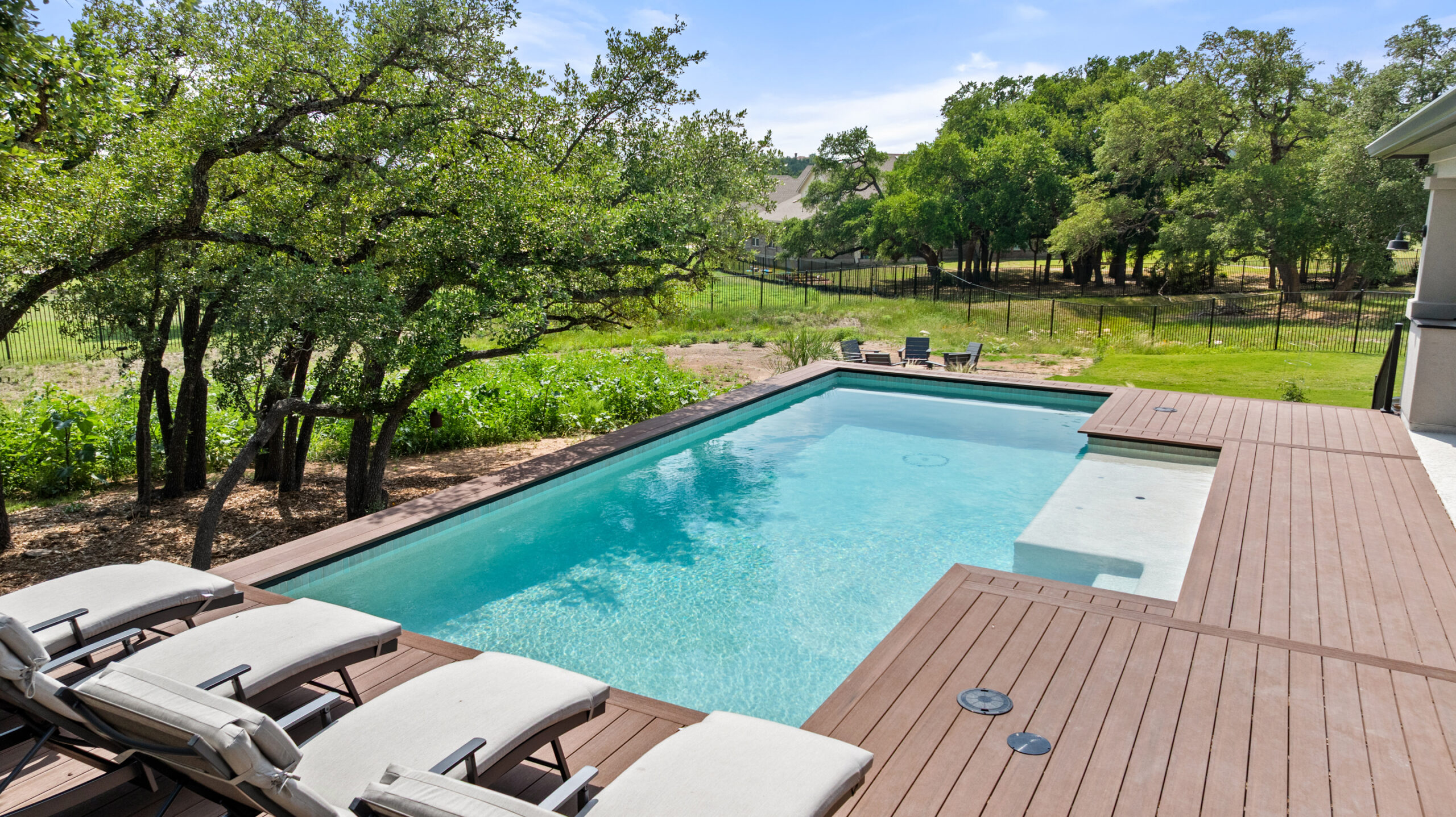 Bright blue water, a custom raised deck, and space made for slowing down and living it up. This custom build features clean lines, a built-in spa, outdoor shower, kitchen, and plenty of room to lounge—all surrounded by serene Hill Country views.