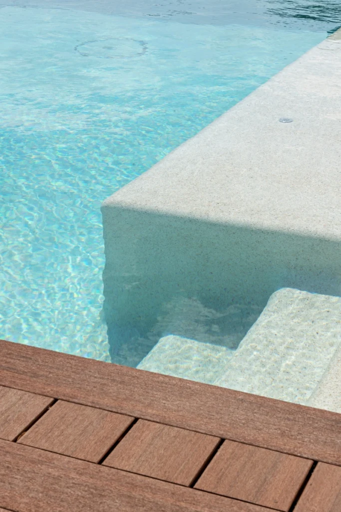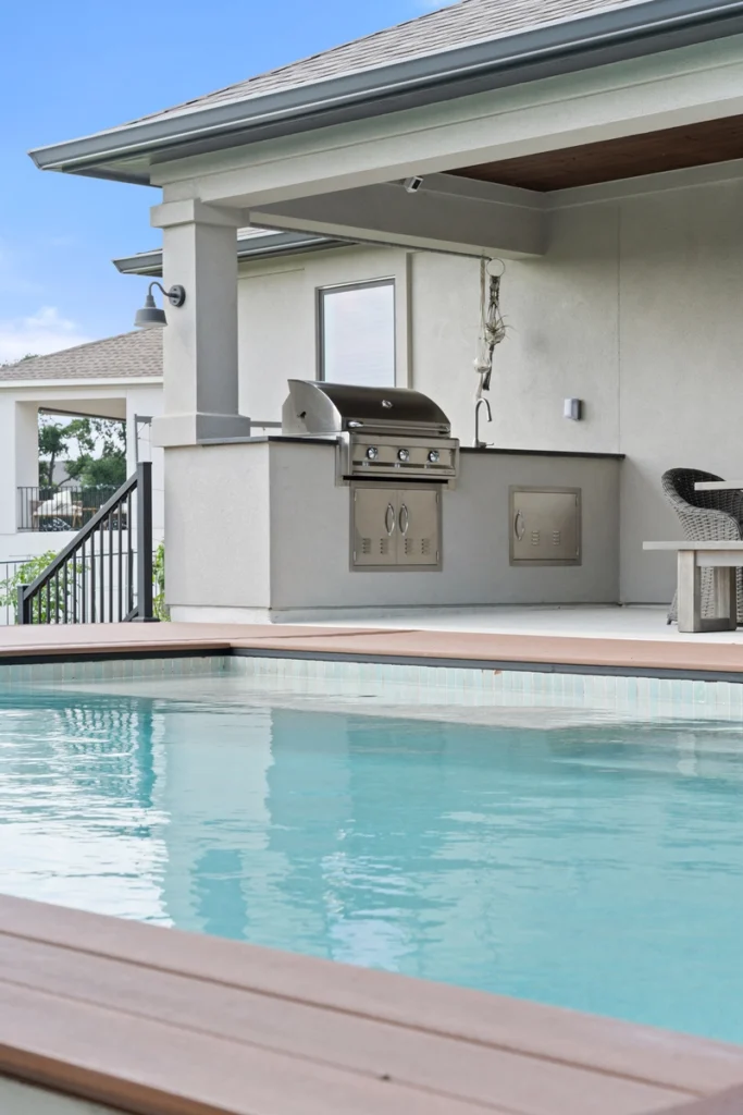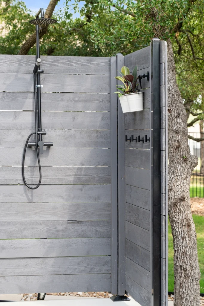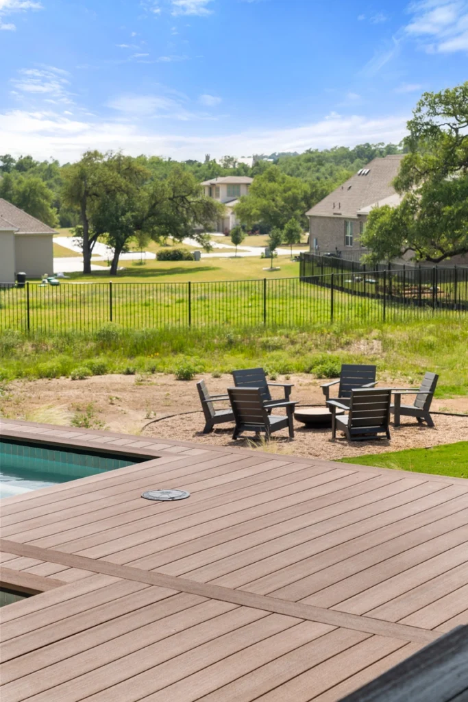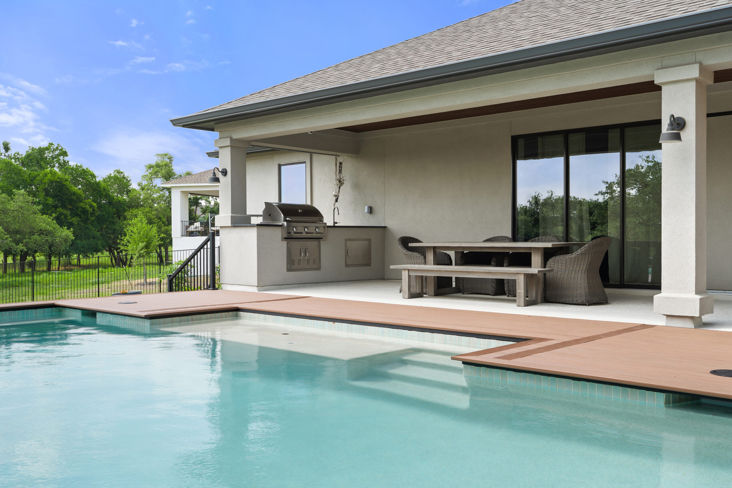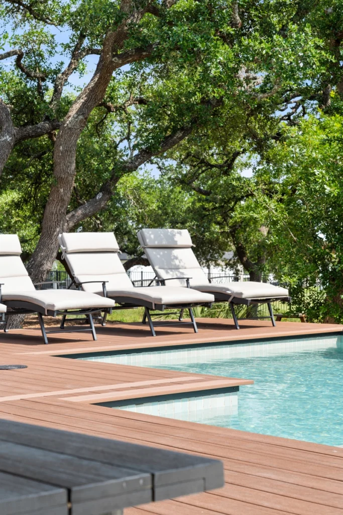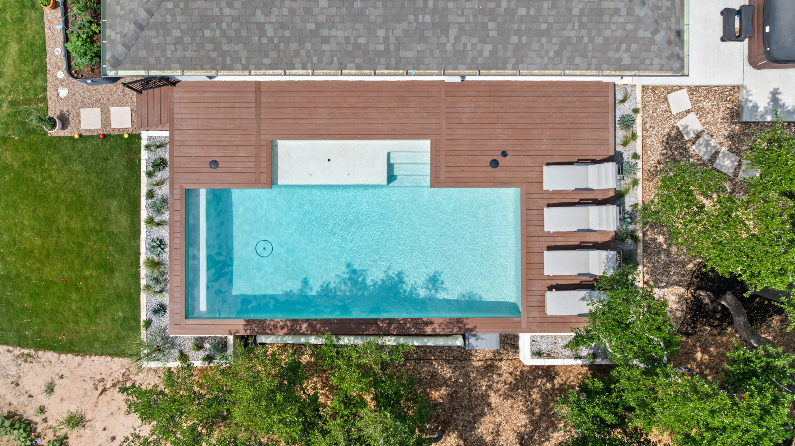 Bright blue water, a custom raised deck, and space made for slowing down and living it up. This custom build features clean lines, a built-in spa, outdoor shower, kitchen, and plenty of room to lounge—all surrounded by serene Hill Country views.