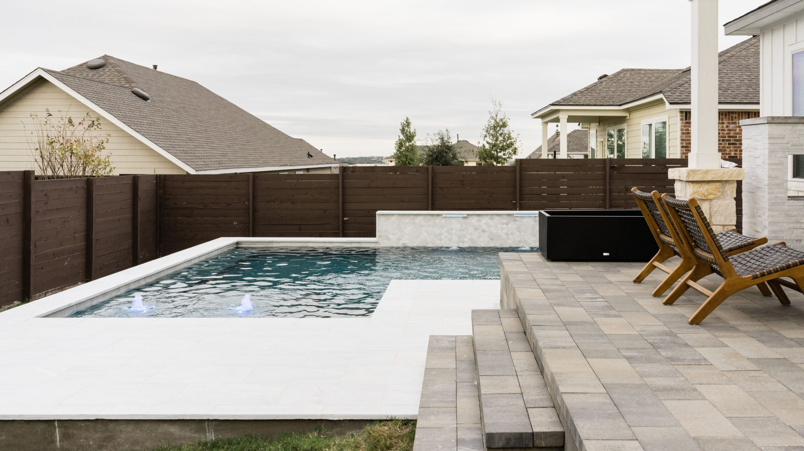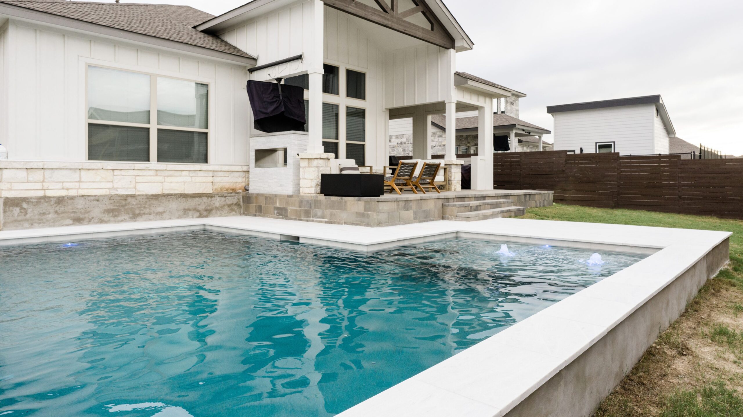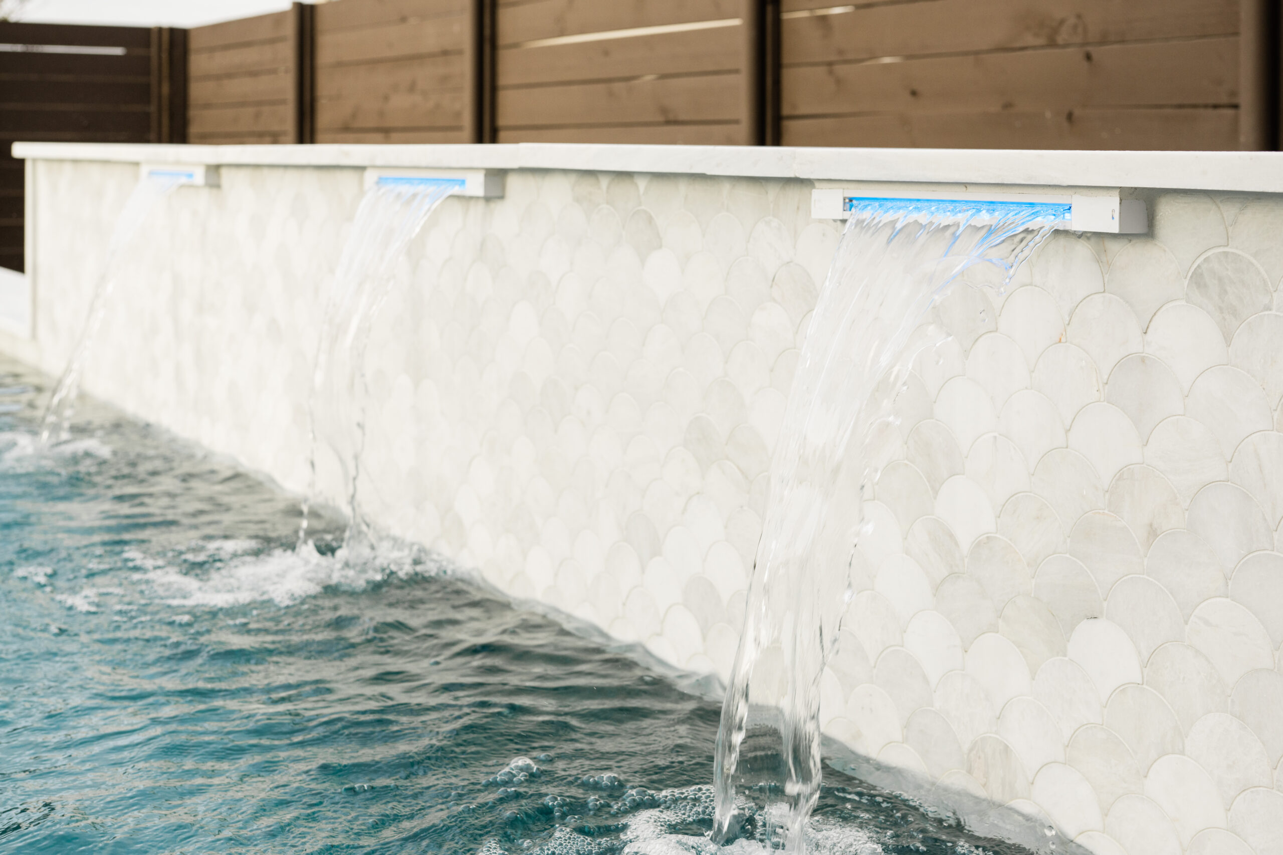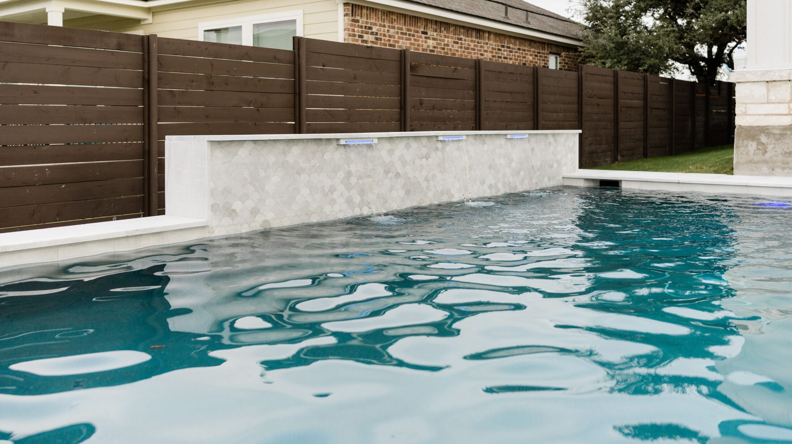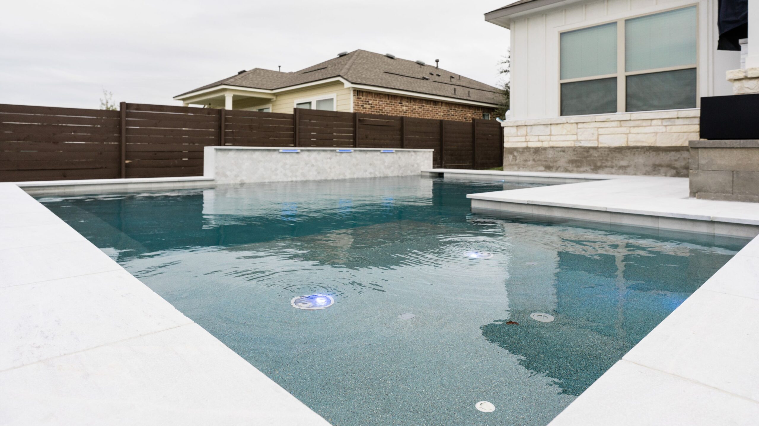 Soft tones, crisp lines, and calming symmetry make this pool feel like a private wellness escape. Scallop tile and tranquil aqua water set the tone, while the tanning shelf invites relaxed play and quiet moments.