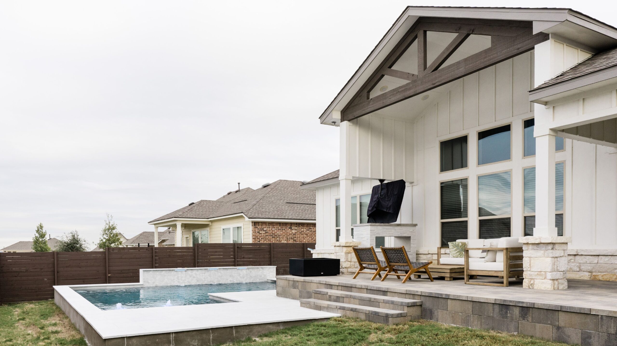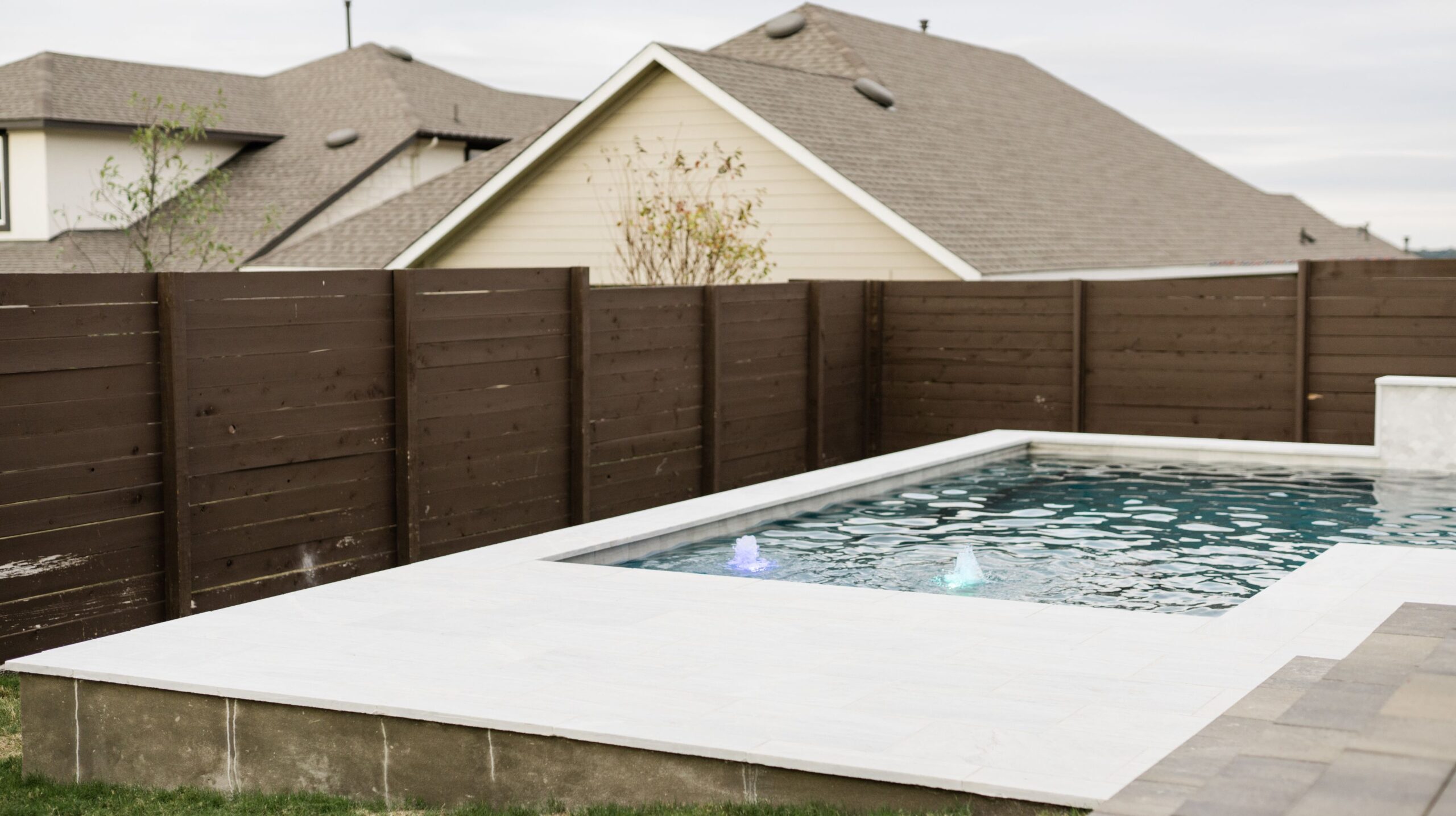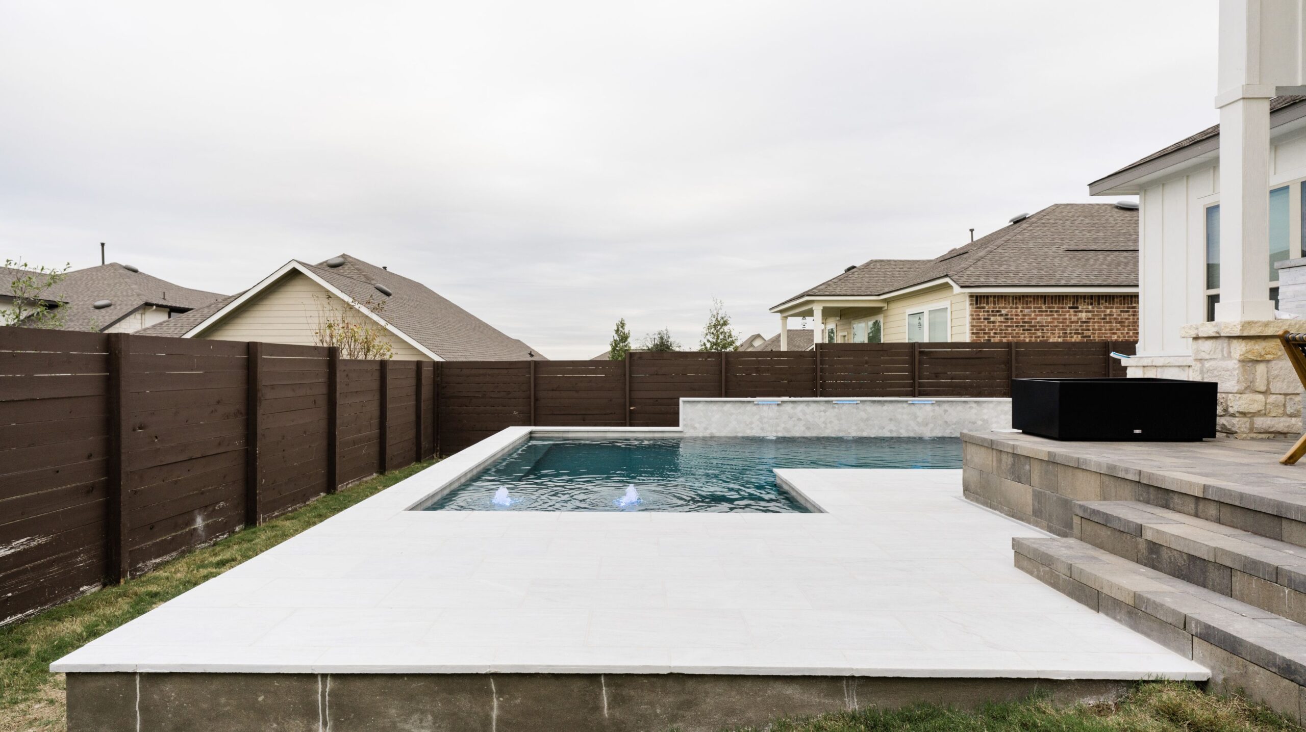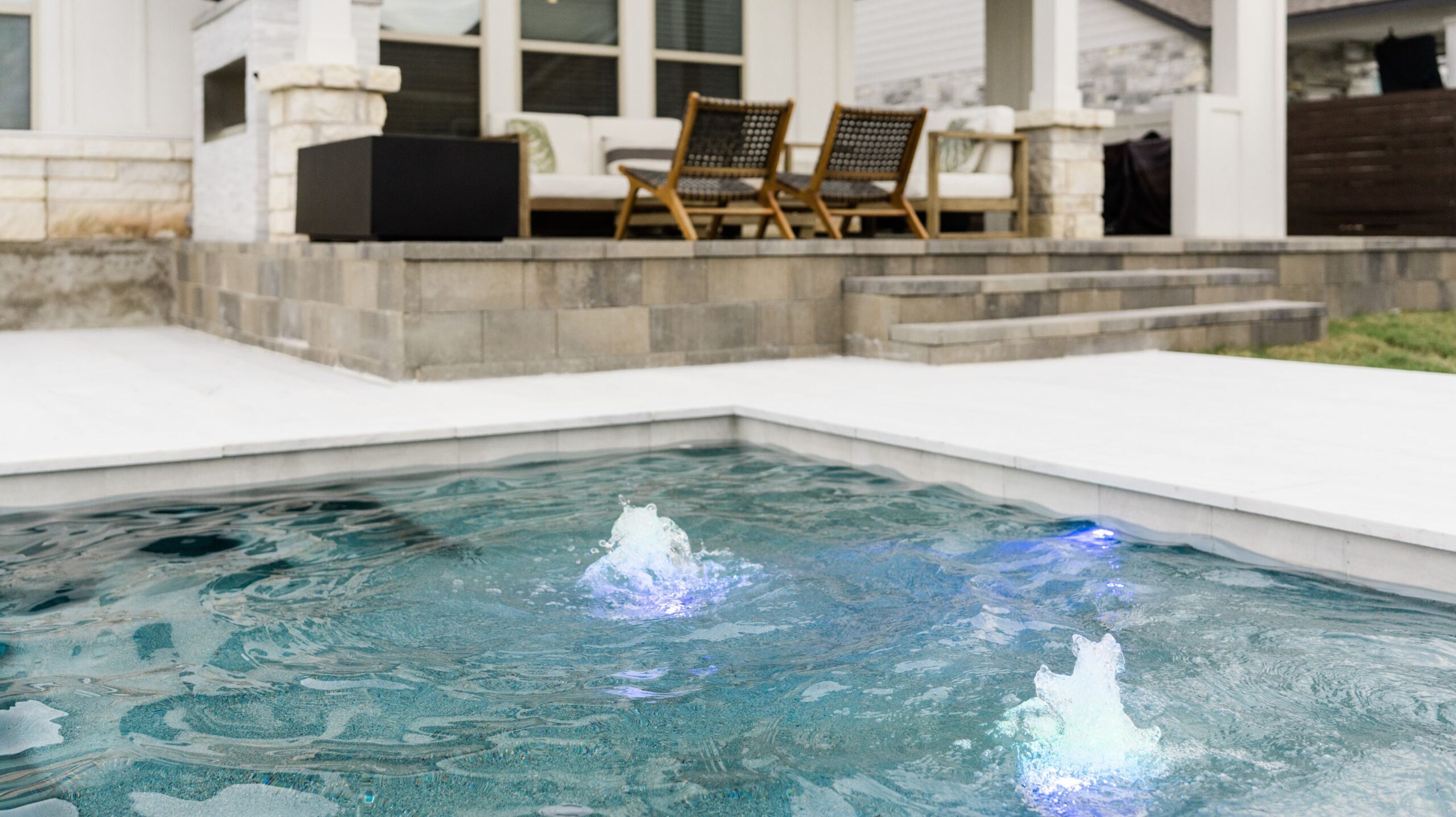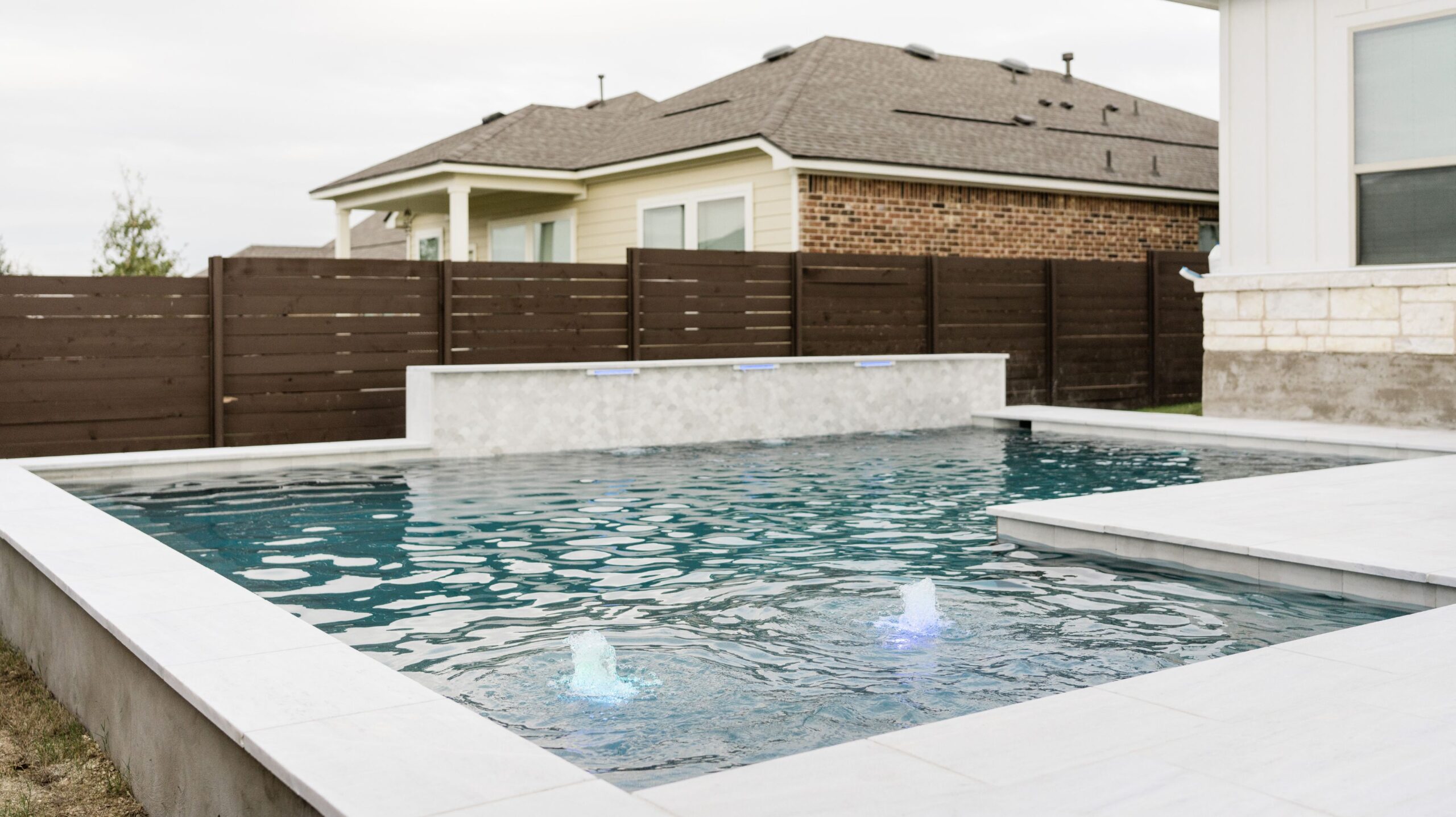 Soft tones, crisp lines, and calming symmetry make this pool feel like a private wellness escape. Scallop tile and tranquil aqua water set the tone, while the tanning shelf invites relaxed play and quiet moments.