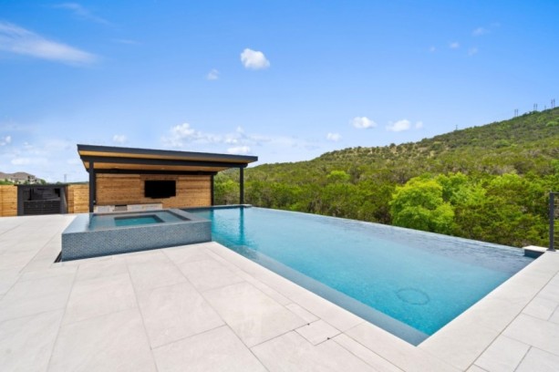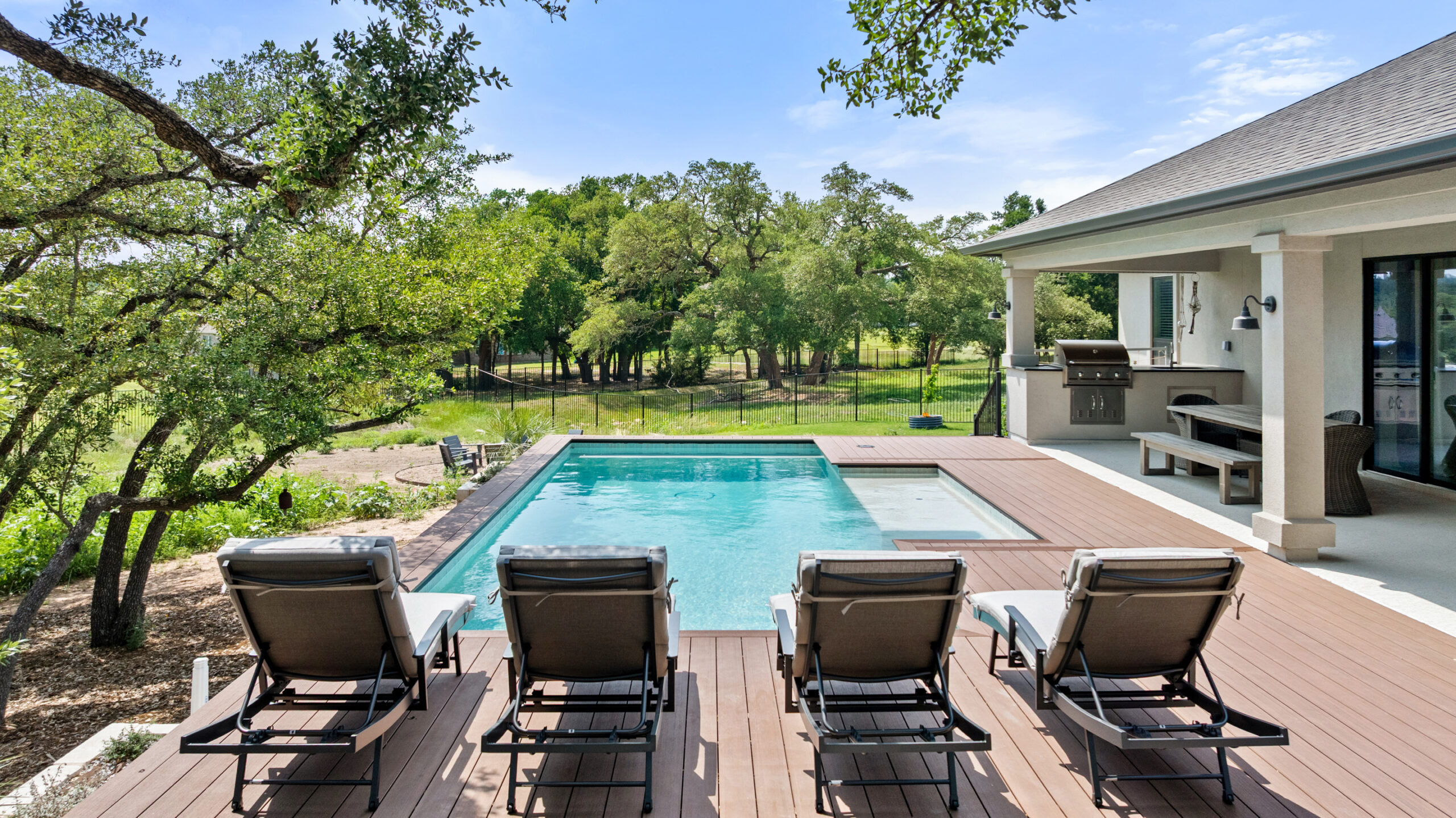 Bright blue water, a custom raised deck, and space made for slowing down and living it up. This custom build features clean lines, a built-in spa, outdoor shower, kitchen, and plenty of room to lounge—all surrounded by serene Hill Country views.